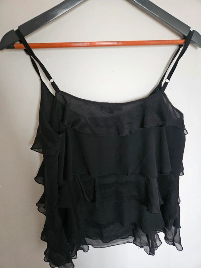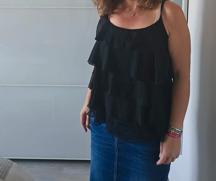 📌Lot 20% de remise dès 5 articles Débardeur en voile, volant sur le devant, fine bretelle ➡️Largeur à plat sous les bras 49 cm➡️ Longueur 61  cm ➡️polyester ou viscose ⭐Excellent état ✈Envoi rapide des colis 💗 Abonnez vous à mon profil, nombreux articles ajoutés régulièrement ! #laetitresors_debardeur40 #laetitresors #debardeur #top #volant #voile #noir #etam #fine #bretelle #fete #occasion #sortie #cocktail
