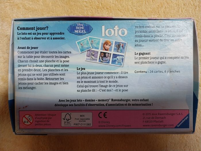 Jeu de loto La reine des neiges 3 ans et plus Boîte endommagée mais éléments en bon état