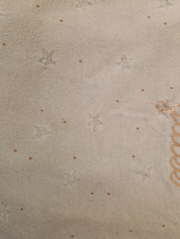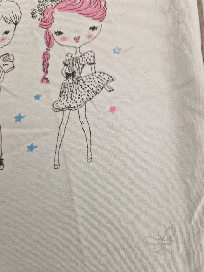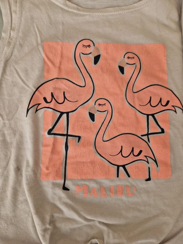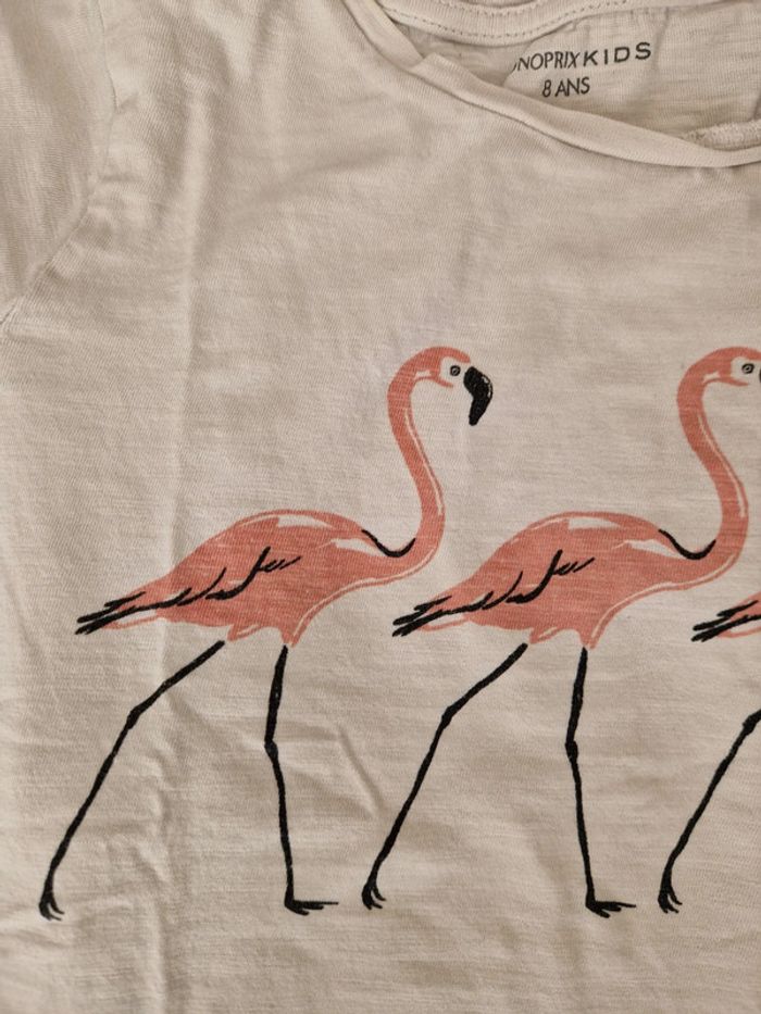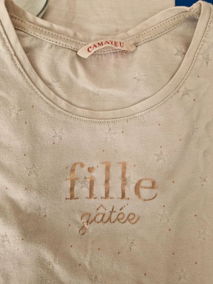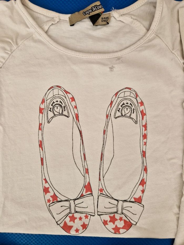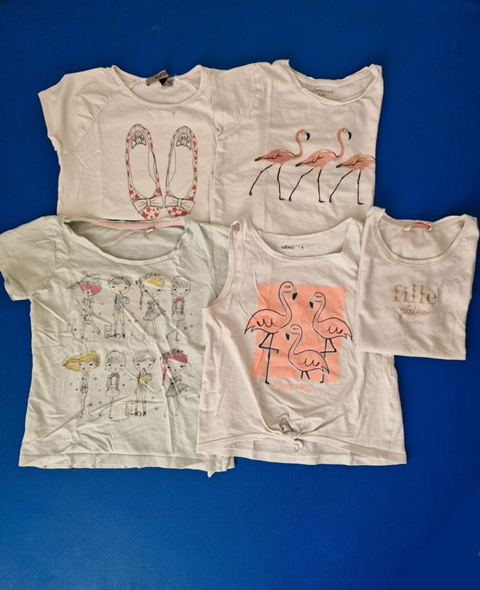 T-shirts et debardeurs blanc ou bleu clair. Différentes marques dont Tape à l'œil, Camaïeu et Monoprix. Motifs chaussons de danse, flamants rose, étoiles. Les t-shirts ont de petites tâches.