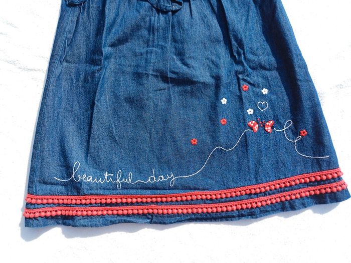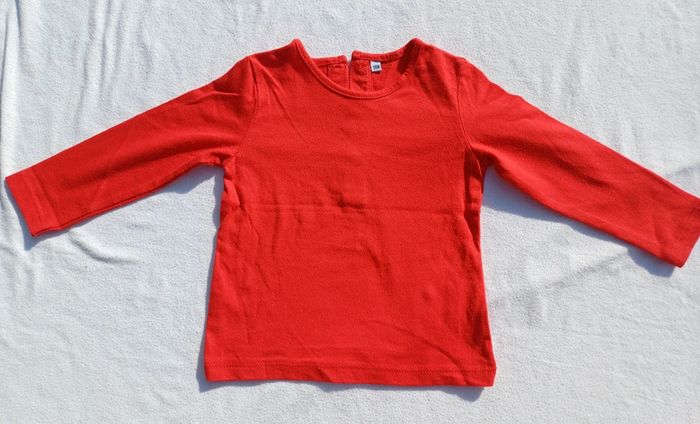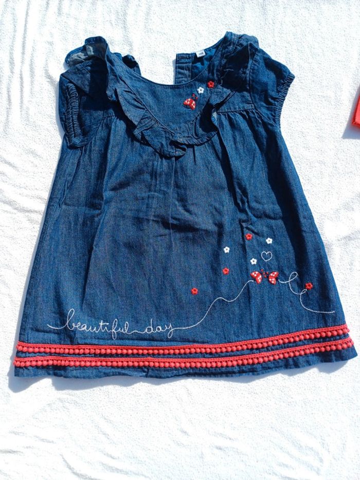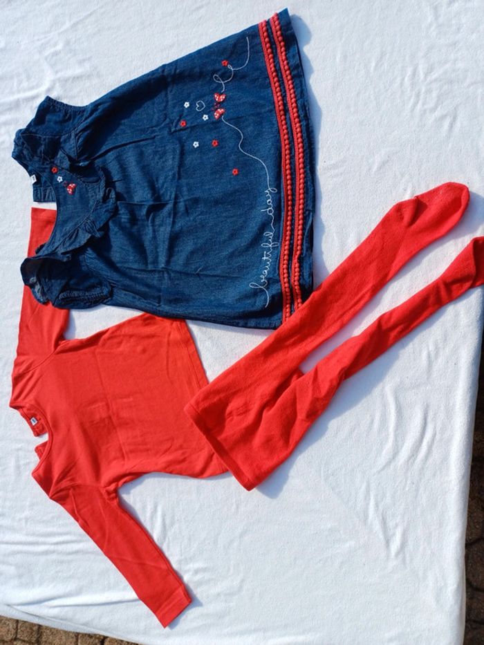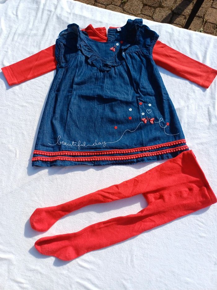 Vends Ensemble 3 pièces Pour fille Taille 18 mois Marque : Plus Comprenant Une robe en jean souple Manches courtes Avec motifs blanc et rouge Un tee shirt manches longues Uni de couleur rouge Une paire de collant en laine De couleur rouge L'ensemble en très bon état Peu porté Prix : 8 euros Maison non fumeur et sans animaux