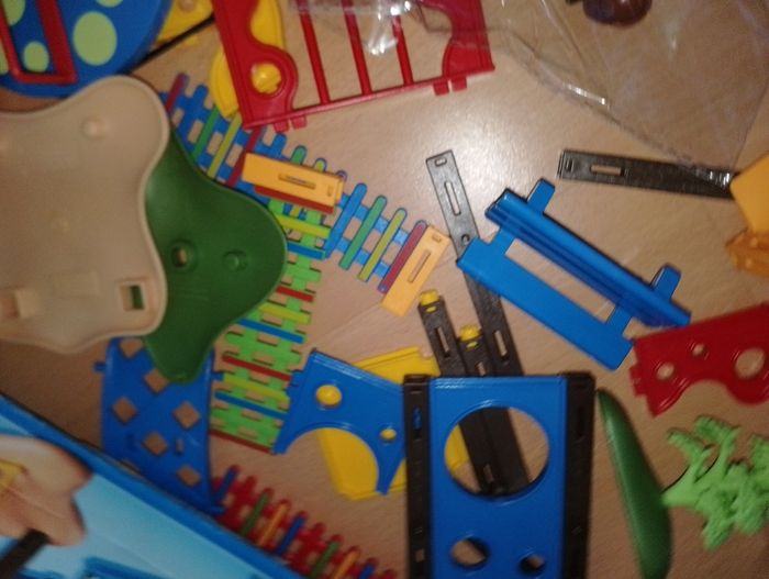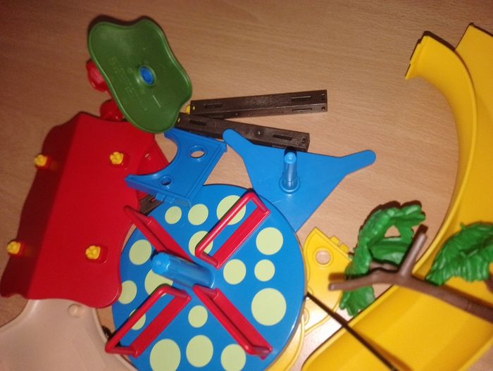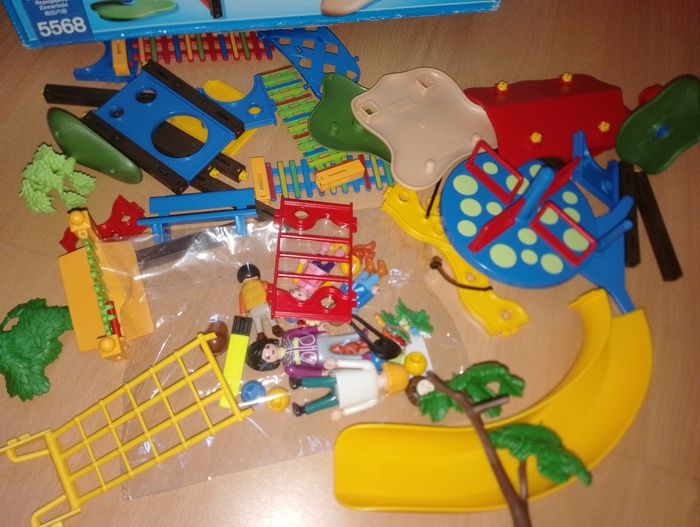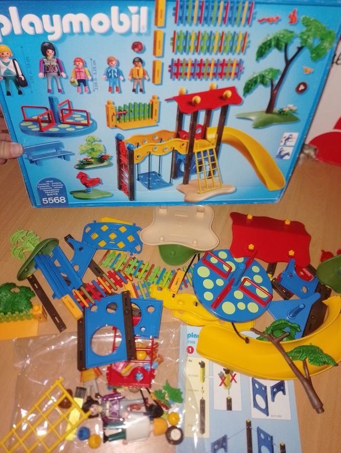5568 square parc enfants Playmobil En très bon état mise a part la barrière verte cassé sur le bord (possible de la coller directement sur le poteau) et manque une boule jaune sur le toit Carton en bon état