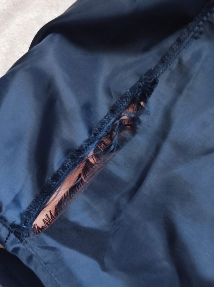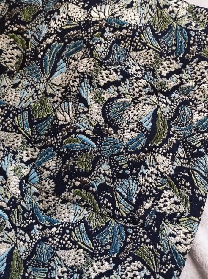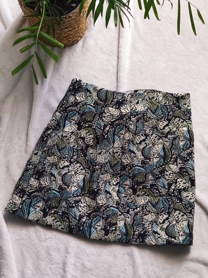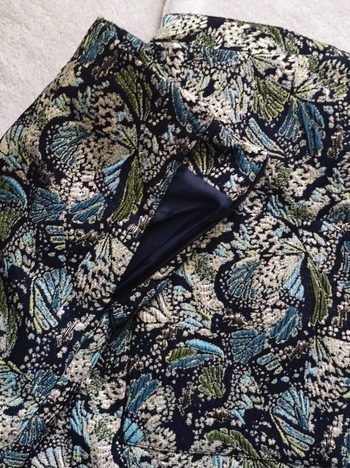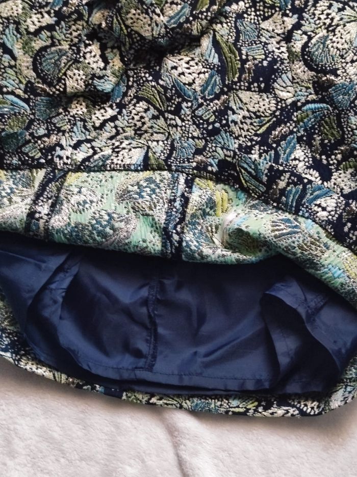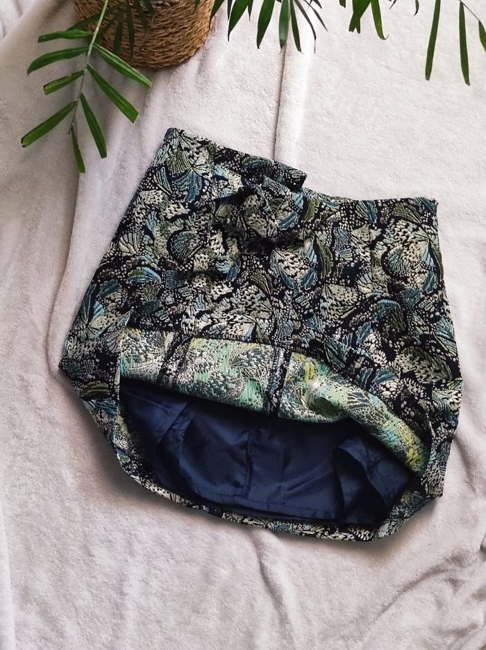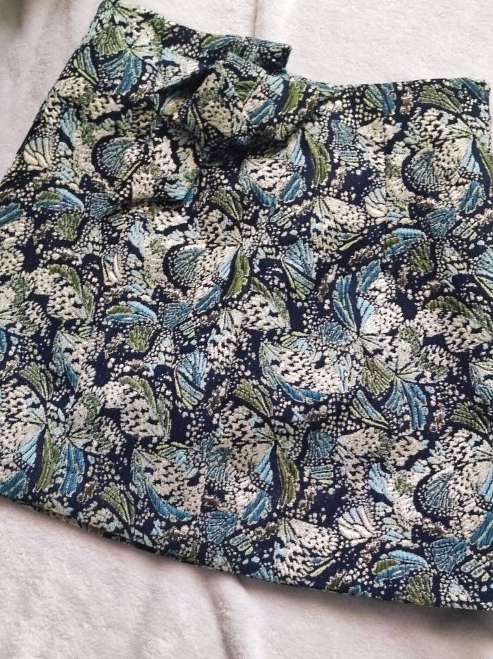 jupe courte jacquart vert/ bleu / doré façon fil brodé et détaillé avec noeud a l'avant et une poche a l'arrière droit. Fermeture éclair sur le côté. En parfait état SEUL la doublure est decousue sur un côté (cf photo) rien de grave en sois mais n'ayant pas de machine je ne peux réparer dans de bonne condition. Se seras à vous de le faire si vous avez les outils pour. Cela ne gêne en rien mis a part cela ni tâches ou trou de visible sauf déchirures dans la doublure. Étiquette taille manquante mais jupe de taille XS. Dimensions Tour de taille 33cm Hauteur ( de bas en haut) 38,5cm Largeur du bas 50cm