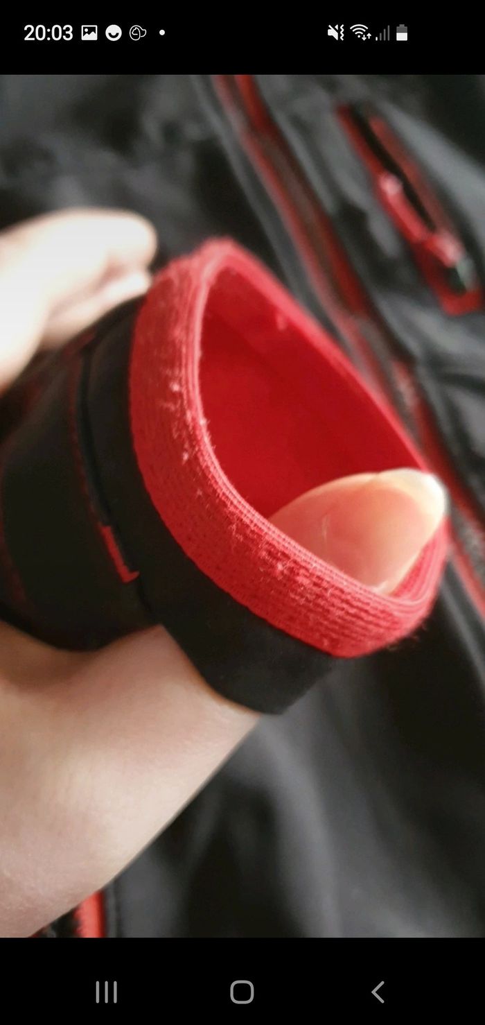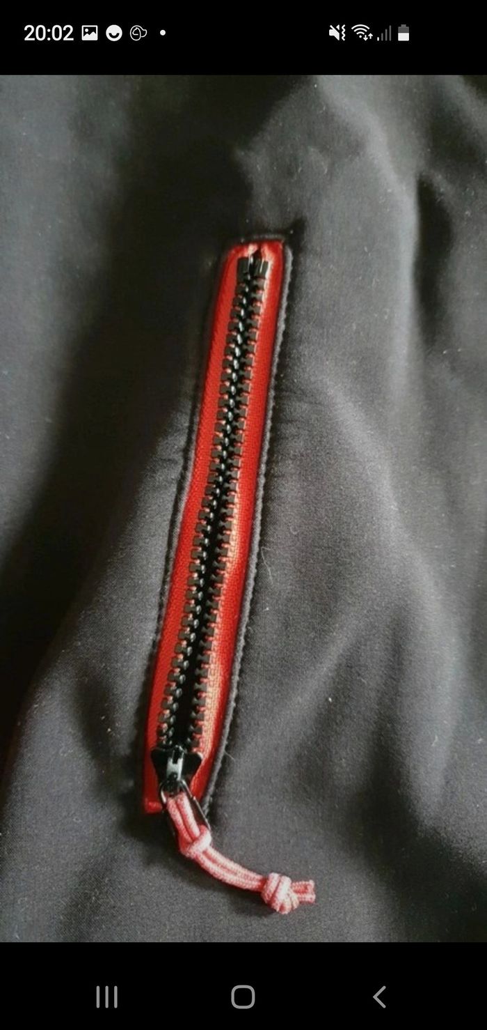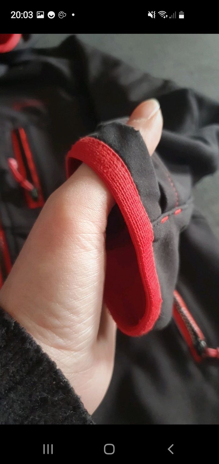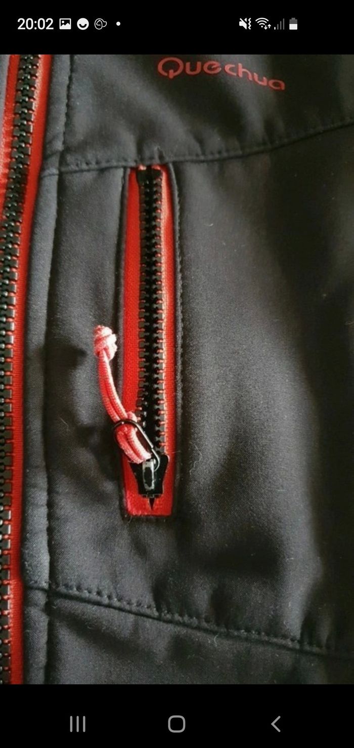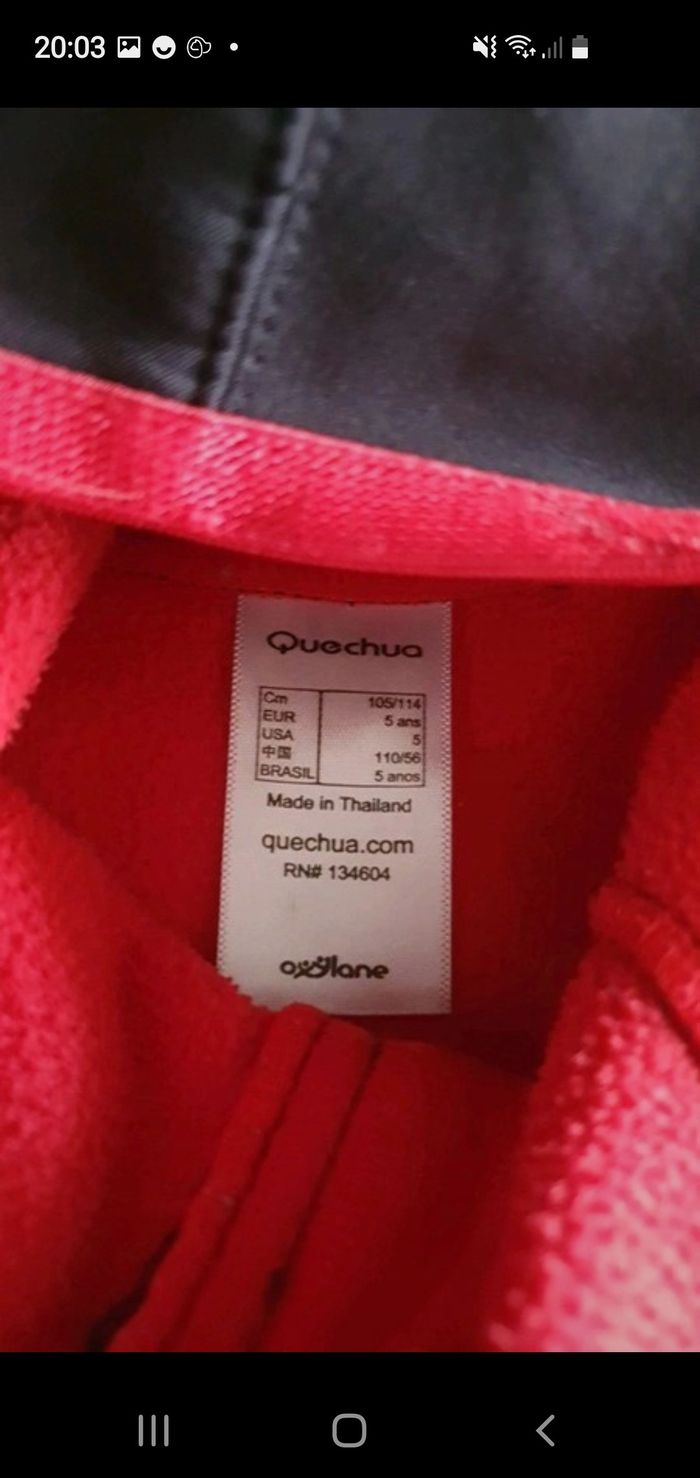 Veste impermeabilise, polaire à l'intérieur qui tient super chaud avec capuche de couleur noir et rouge. Deux trois de chaque cotés des manches pour laisser passer les pouces. La marque Quechua Taille 5 ans État impeccable pas de taches ni de défauts