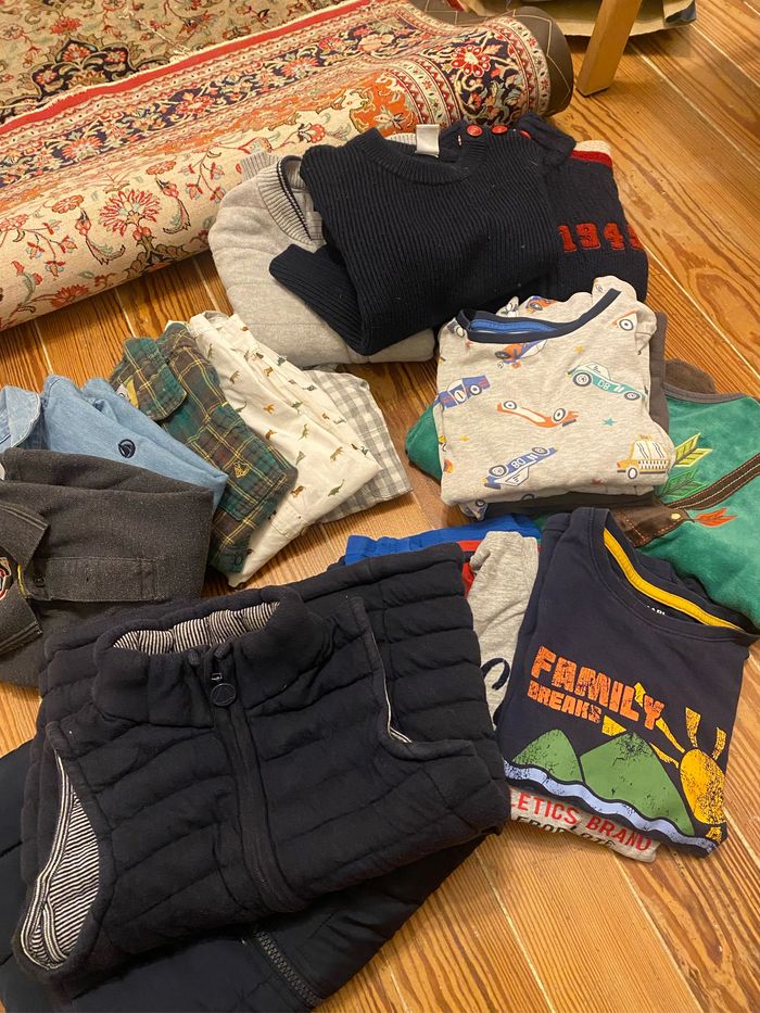 Lot de vêtements 5 t-shirts (kiabi- aeropilote-orchestra) 4 chemises (petit bateau-kiabi- okaidi) 2 gilets (okaidi-gant) 1 pull petit vateau 2 pyjama (dpam) 2 vestes sans manche (petit bateau-gap) 1 pilou pilou renard Plus de photos n’hésitez pas. Ce sont les derniers vêtements encore en état d’être porté de mon fils. Bon état général. Pas de trous, 1-2 tâches très légères. 5 ans et 6 ans en fonction des pièces.