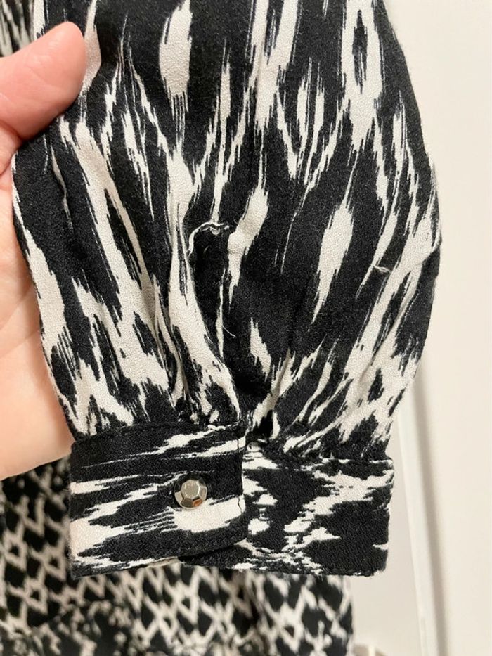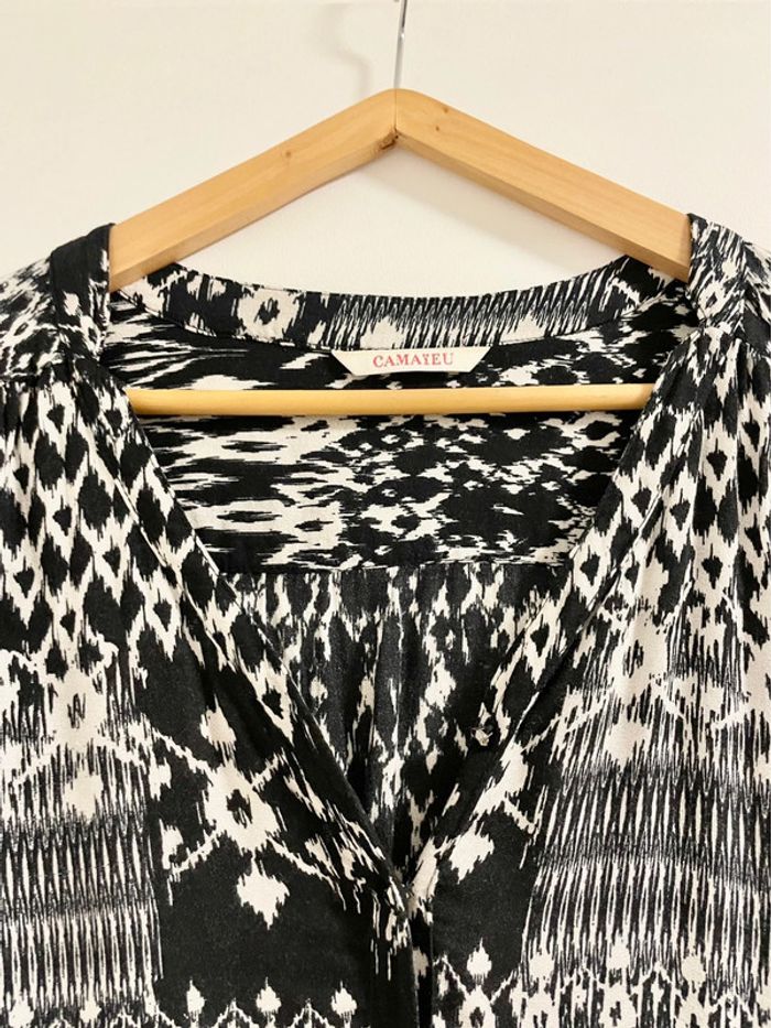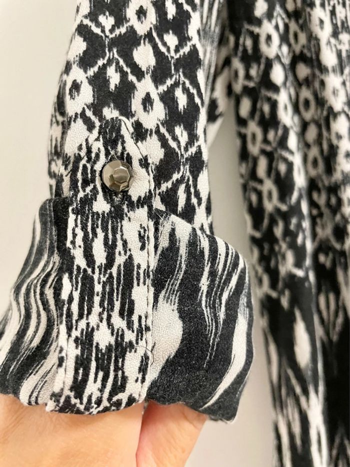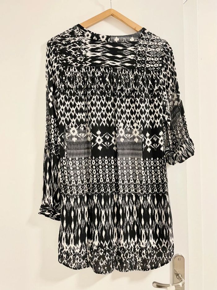 ▫️tunique à motifs noirs et blancs, légèrement évasée ▫️col V avec boutons ▫️possibilité de raccourcir les manches en 3/4 ▫️taille S ▫️longueur 80 cm env