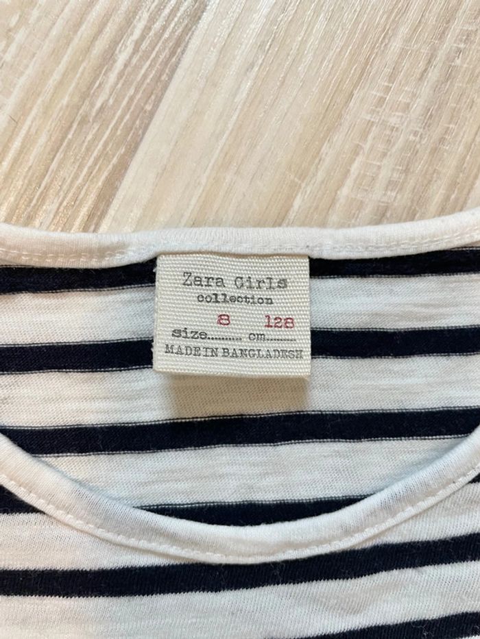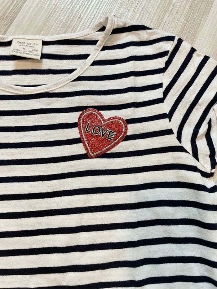 ▫️joli tee-shirt marinière manches courtes, col rond, revers aux manches ▫️motif cœur pailleté sur le devant ▫️taille 8 ans #zara #teeshirt #mariniere #8ans