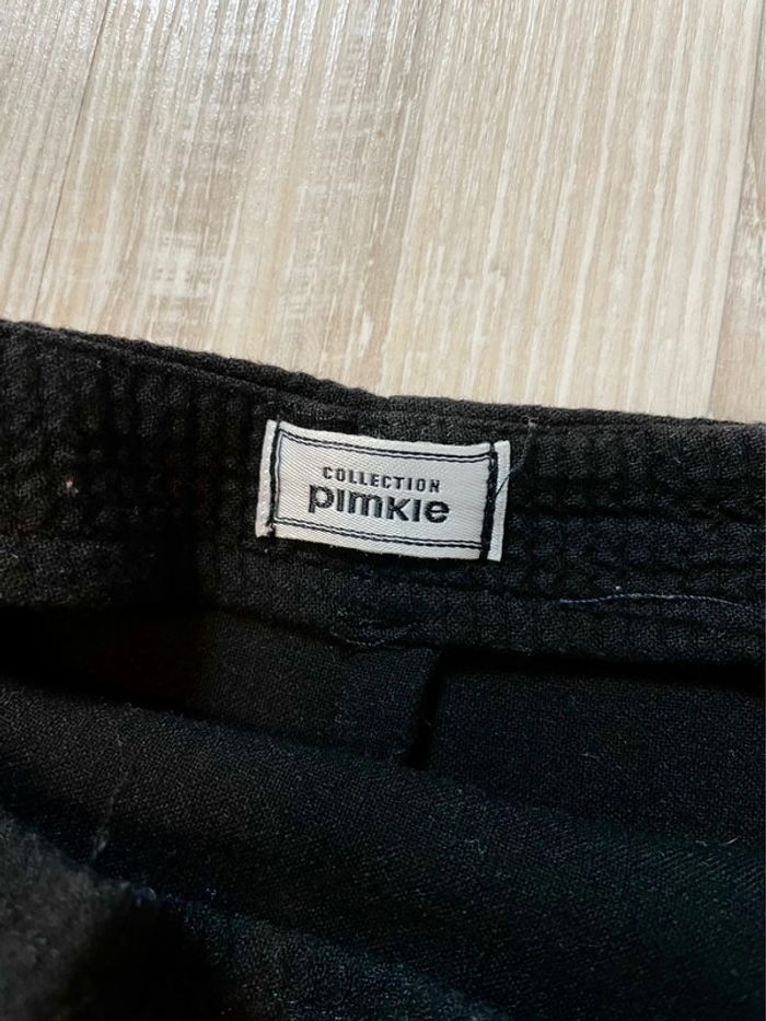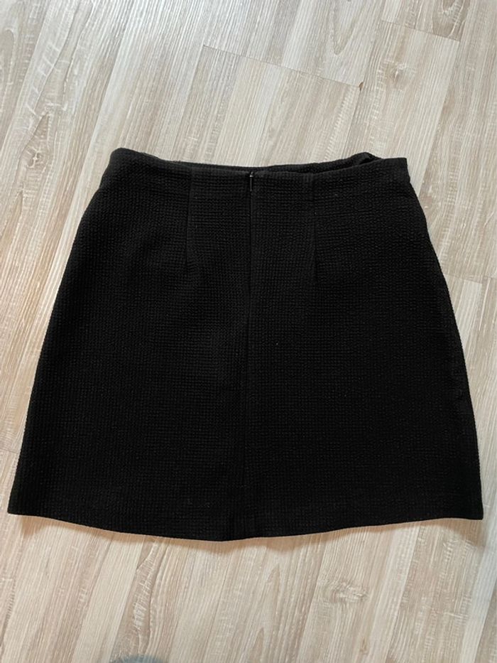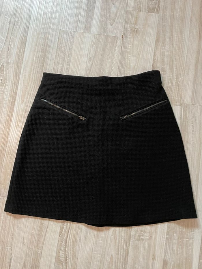 ▫️jupe courte noire, forme trapèze ▫️fermeture à l’arrière de la jupe ▫️matière légèrement gaufrée, fermetures décoratives sur le devant ▫️taille : 36 cm ▫️longueur : 42 cm #jupe #jupenoire