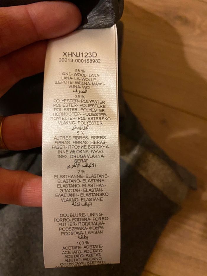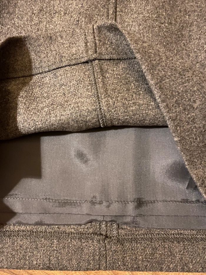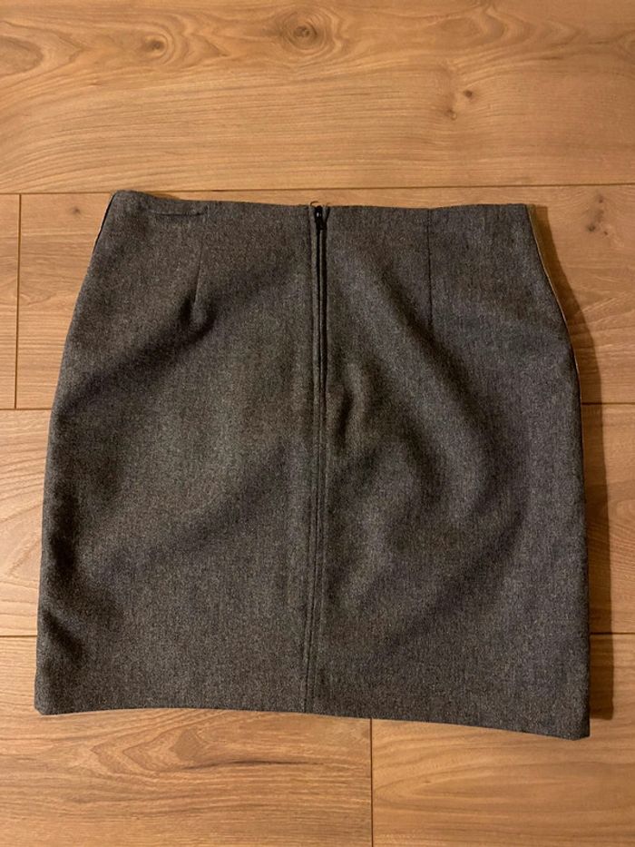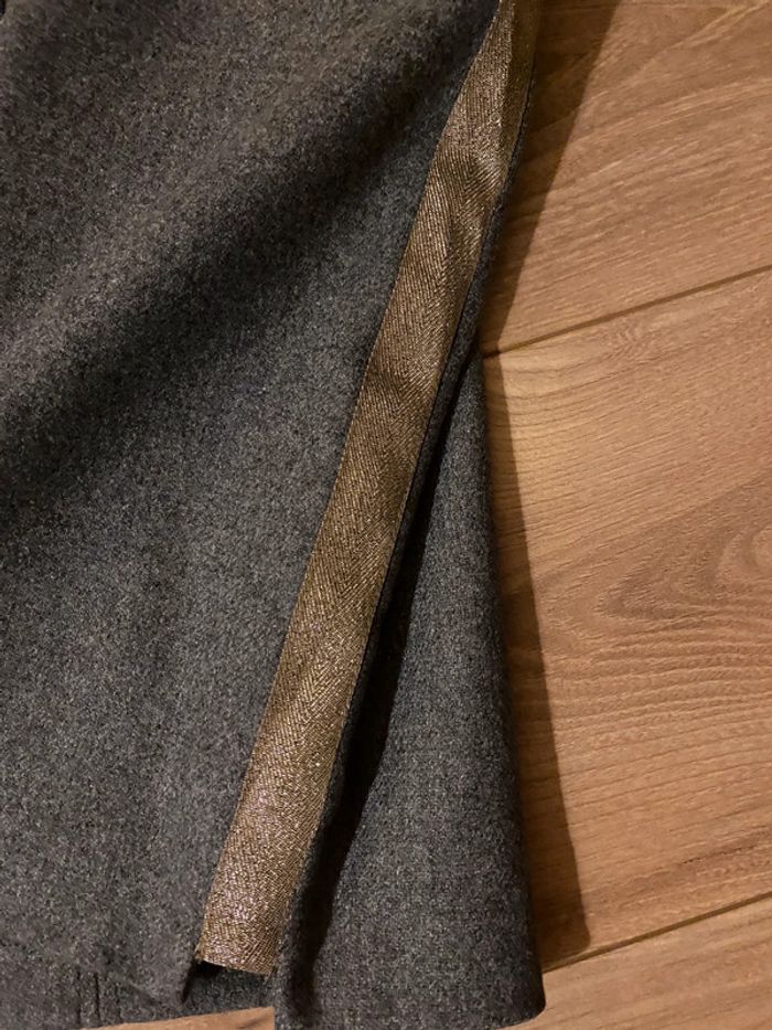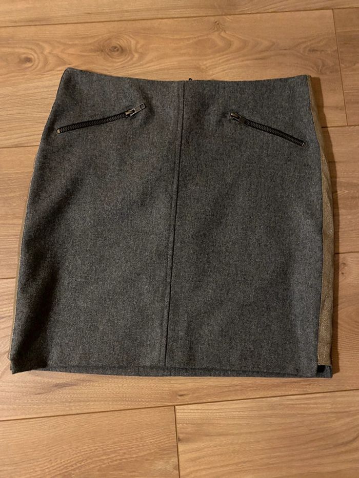 Jolie jupe en laine grise entièrement doublée avec bandes verticales en bronze pailleté sur les 2 côtés Fermeture éclair + petit crochet à l’arrière pour fermer la jupe Dimensions : longueur 42 cm environ et tour de taille 72 cm environ Taille 36 Article neuf, jamais porté #lmpereiravetementsfemme