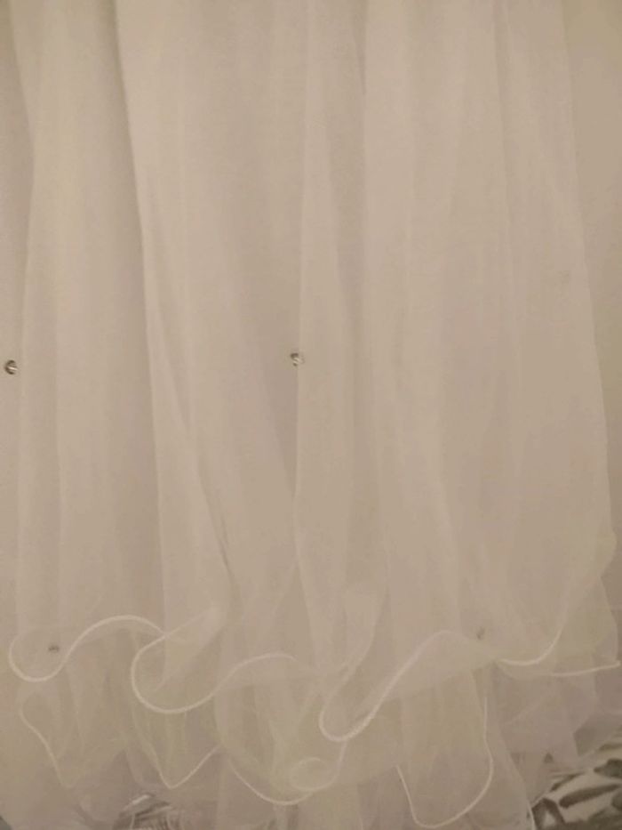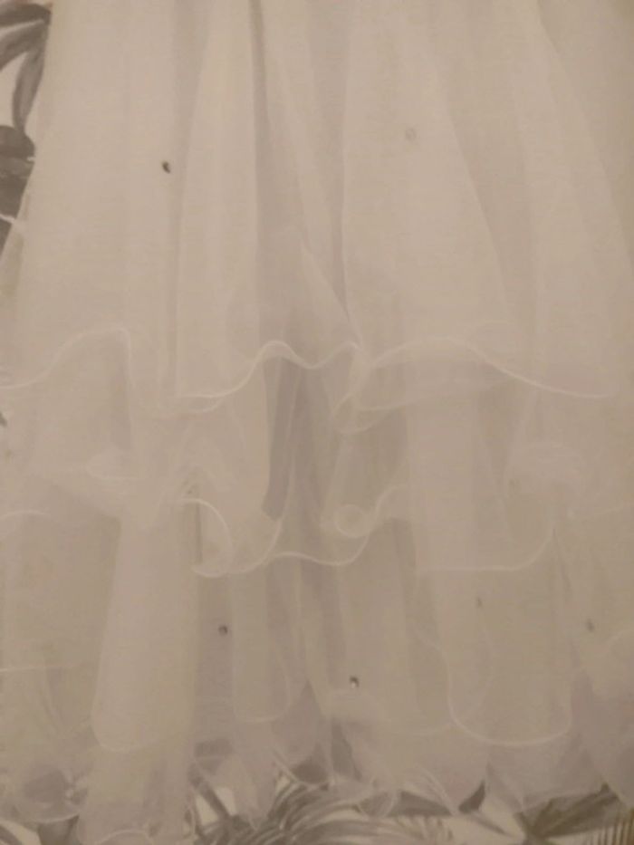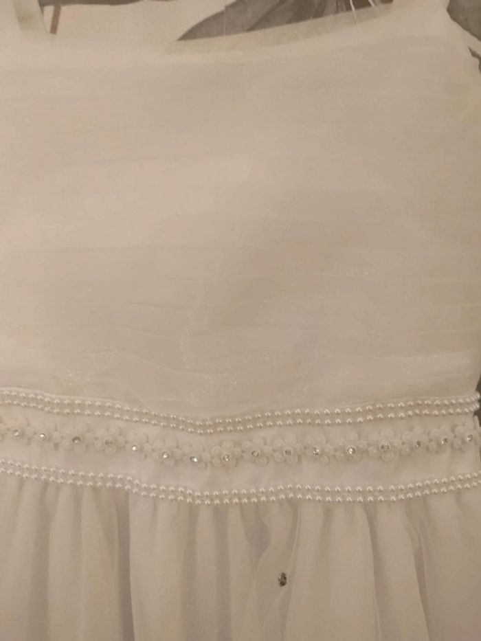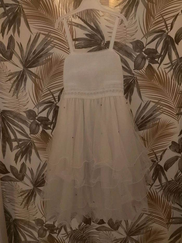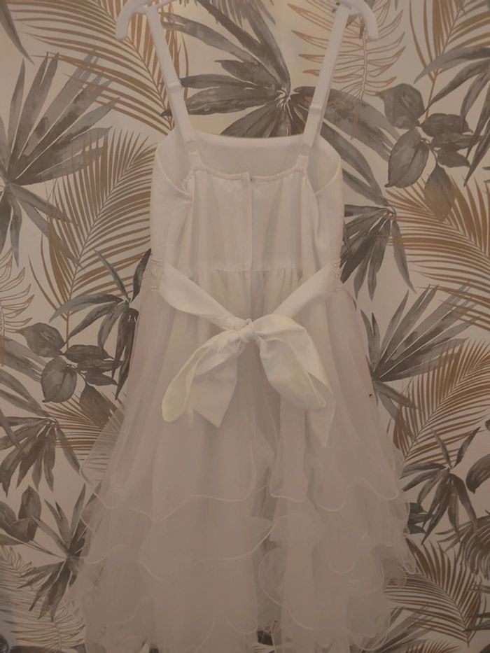 Robe blanche de cérémonie En tulle Ceinture perlé, strass sur le jupon et volant Bretelle réglable Fermeture dans le dos par fermeture Noeud dans le dos Taille 8 ans