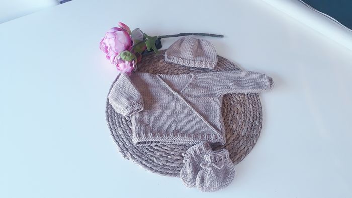 Ce modèle est prévu pour la sortie de maternité, mais si vous souhaitez faire une taille plus grande n'hésitez pas à me le demander 😉. Possibilité de faire d'autres couleurs. Composition : - 30% laine - 50% polyamide - 20% acrylique Entretien facile : - Programme laine (30°c) - Essorage doux 400 tr/min - Pas de sèche linge ni repassage