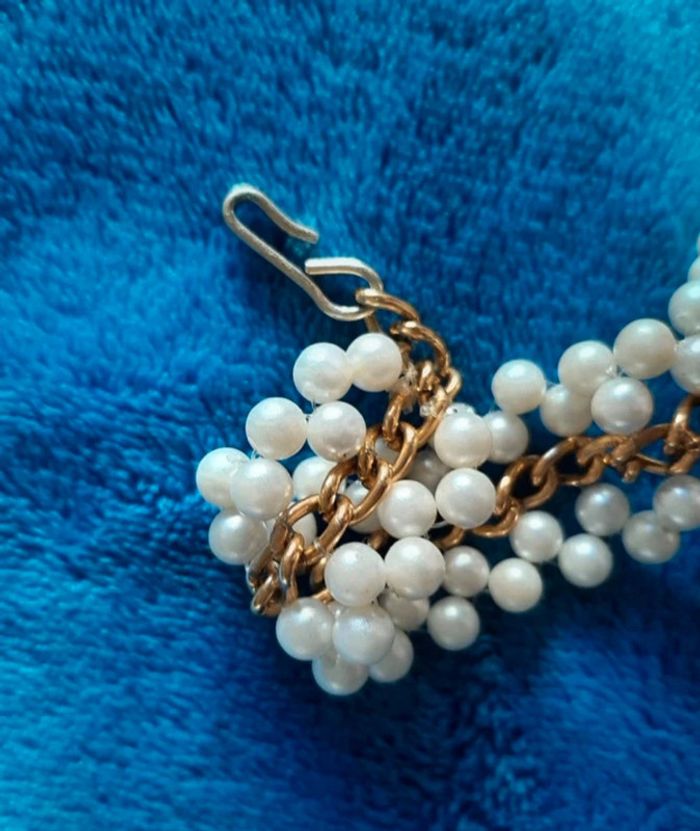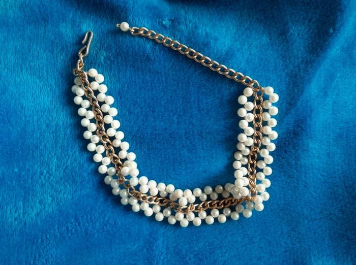 Joli collier doré et perlé (pas de vraies perles). Perles de couleurs blanc/blanc cassé. Fermeture comme sur la photo. Il n'est pas abimé, très bon état. Je le vends au prix de 10 euros. #Bijouxmarine