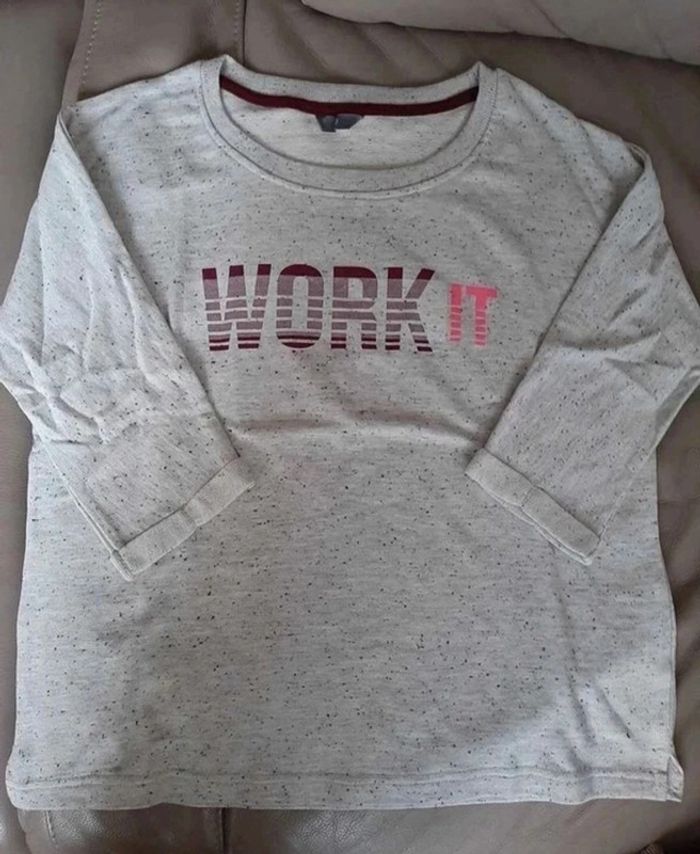 Pull manches 3/4 "Work It" de sport. Taille 40. Il n'a jamais été porté. Chouette matière, et couleurs douces, un peu "moucheté". Je le vends au prix de 10 euros. #TailleL40marine
