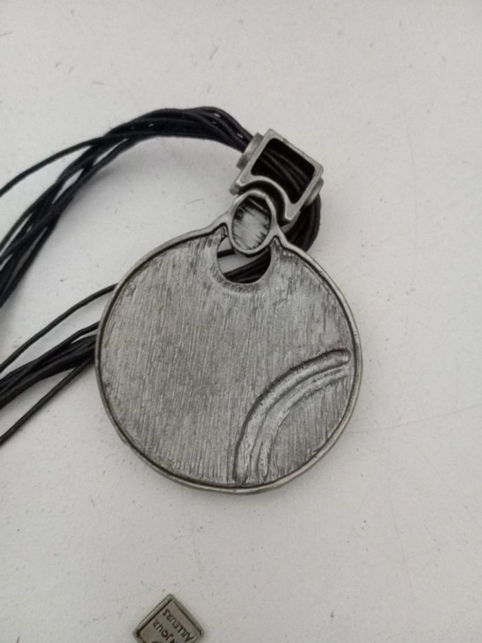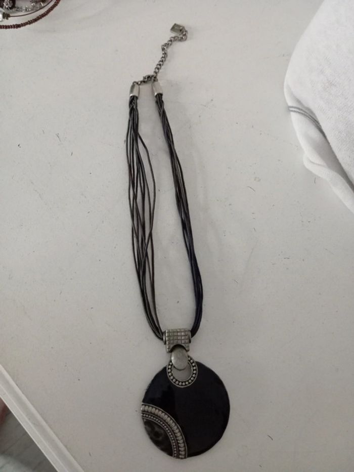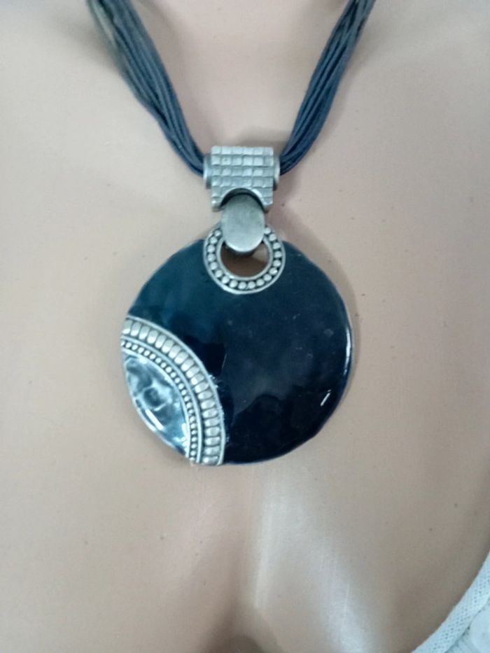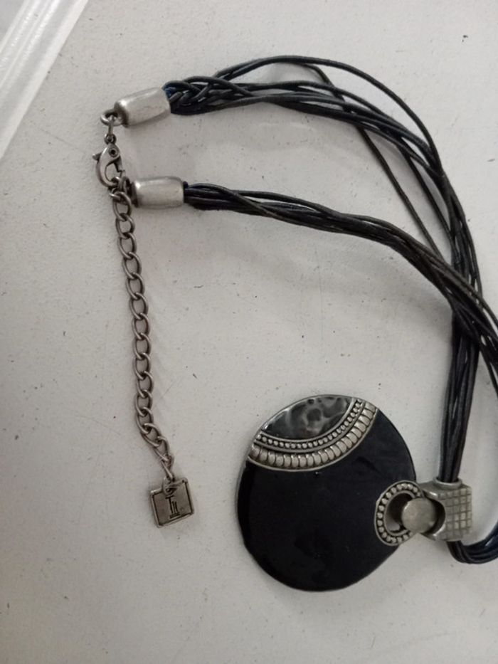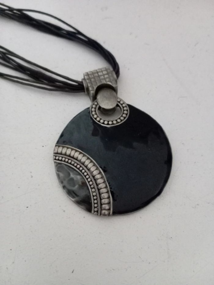 Très bon état gros pendentif noir en métal sur cordelettes noires Pensez aux lots ! #baronnecollier #baronneunjourailleurs