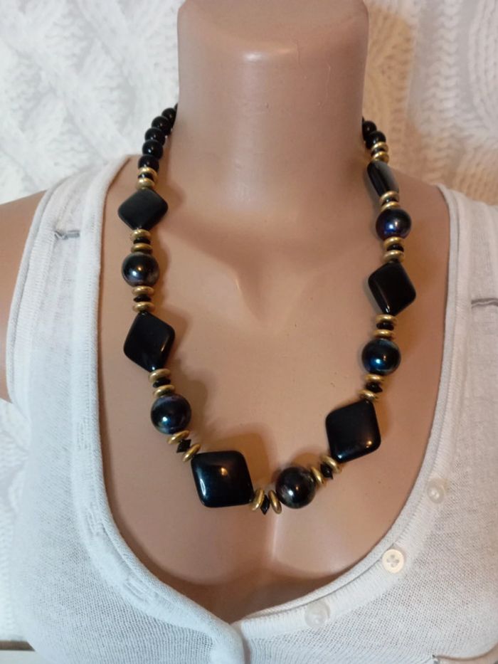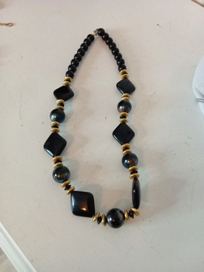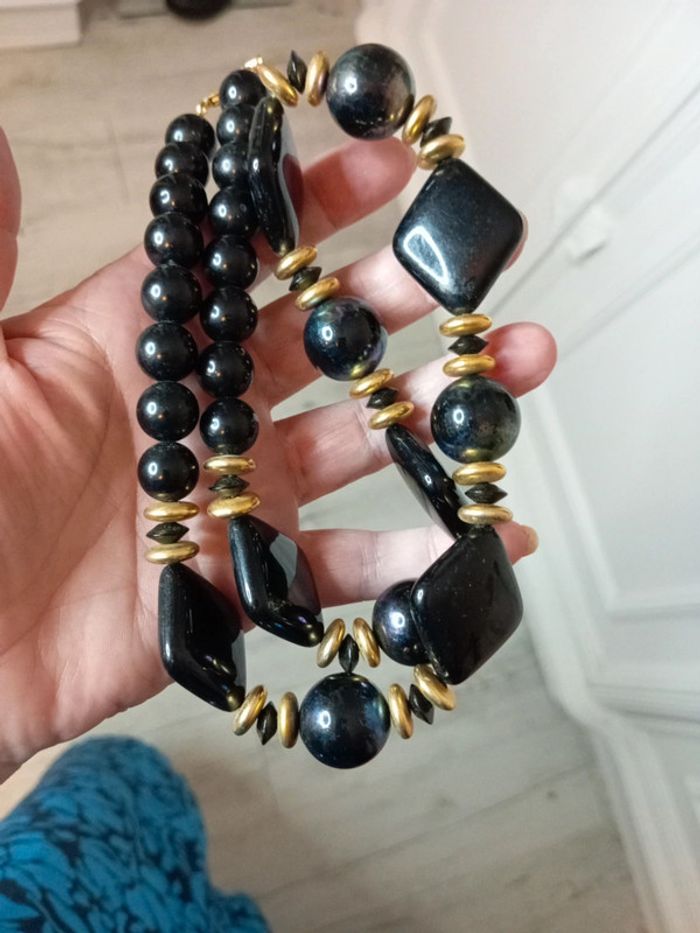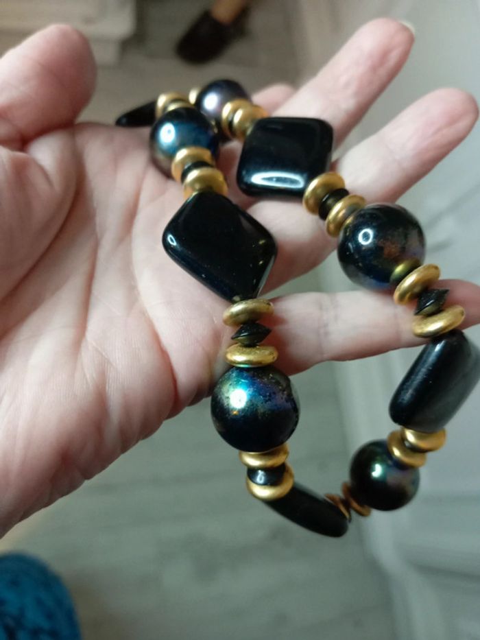 Il n'est pas tout à fait noir les perles rondes ont des reflets moirés. Entrecoupé de perles dorées Très bon état Pensez aux lots ! #baronnecollier