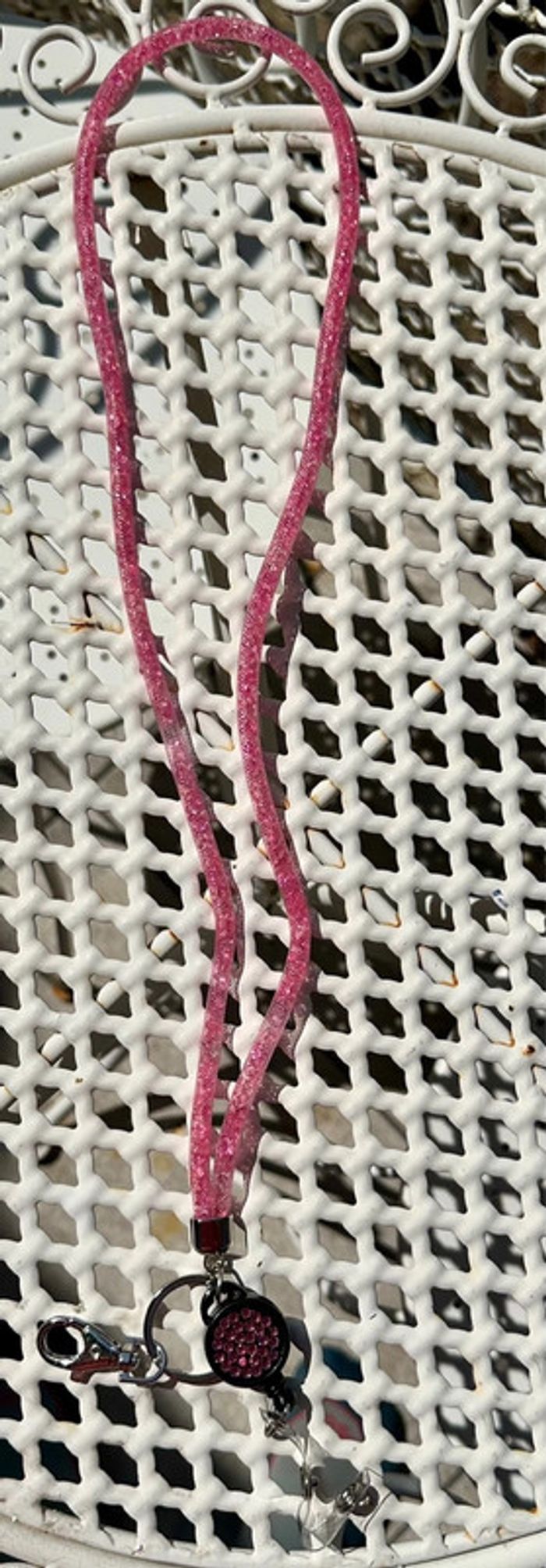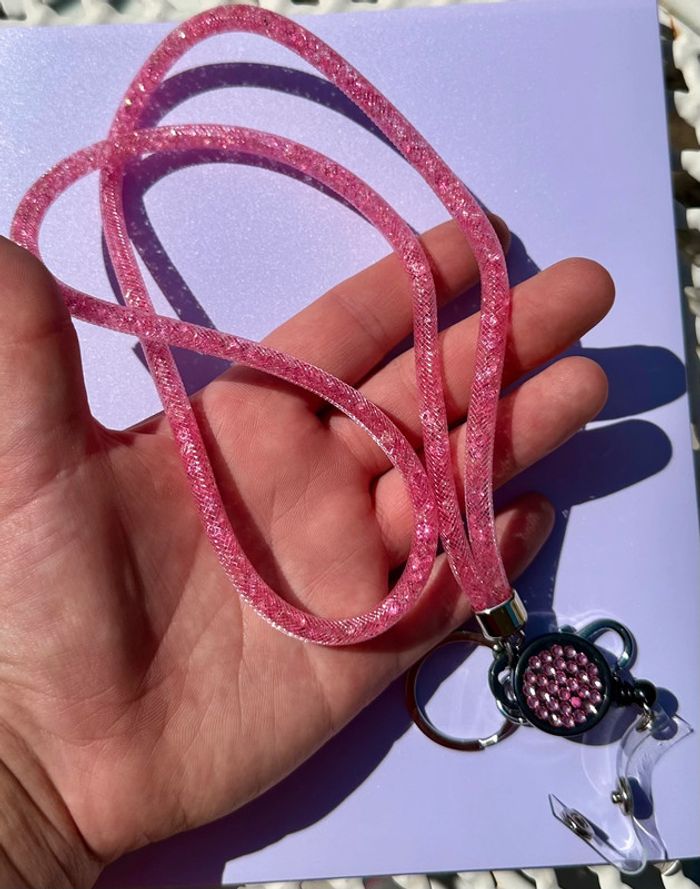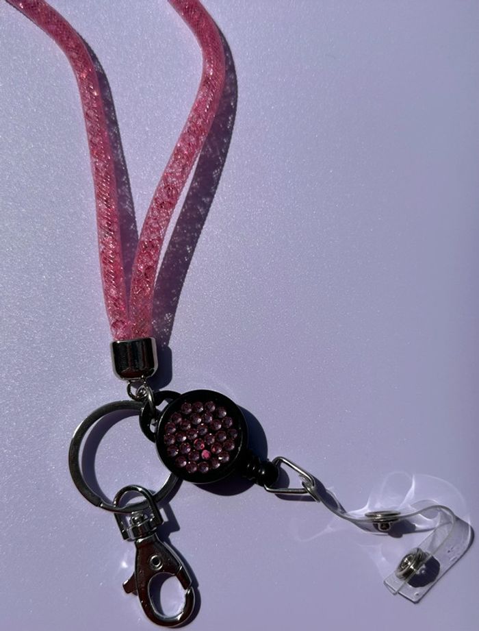 Porte badge rose avec enrouleur. Petites perles en plastique rose. Léger défaut de couleur sur l’enrouleur sinon comme neuf.