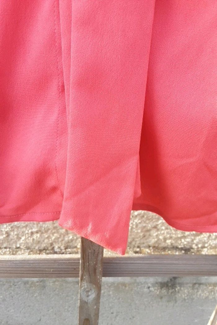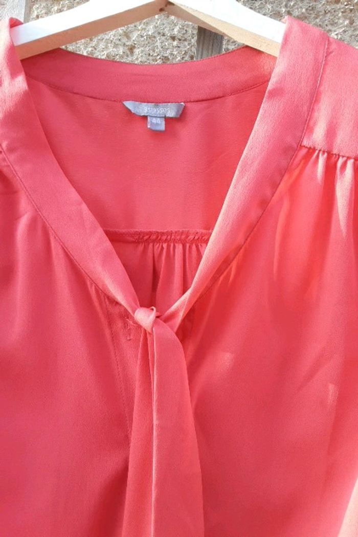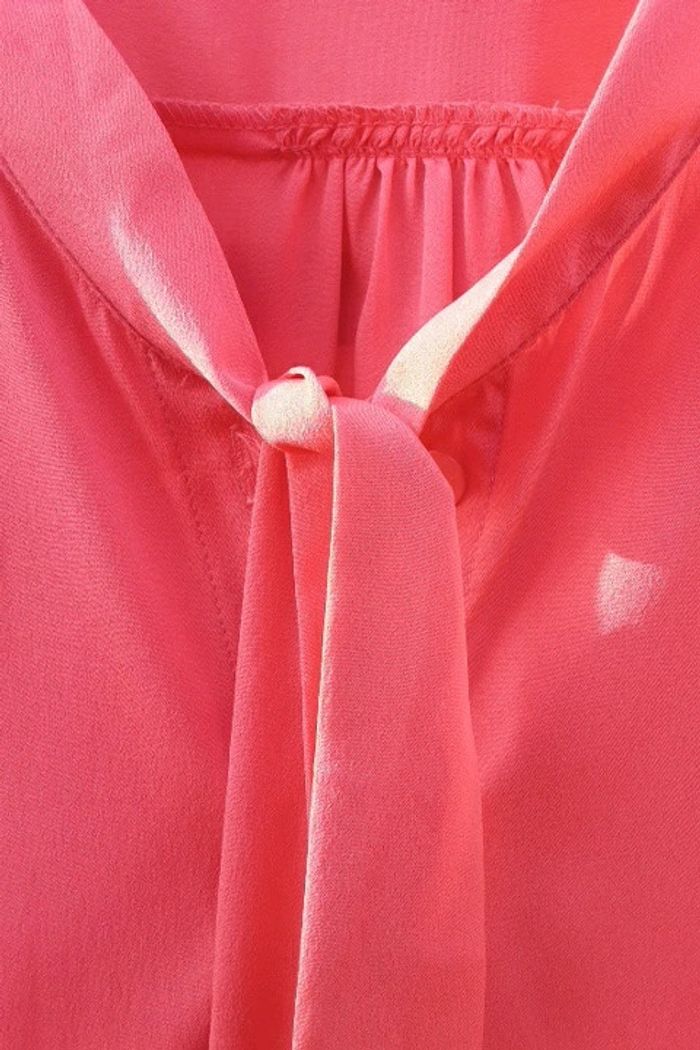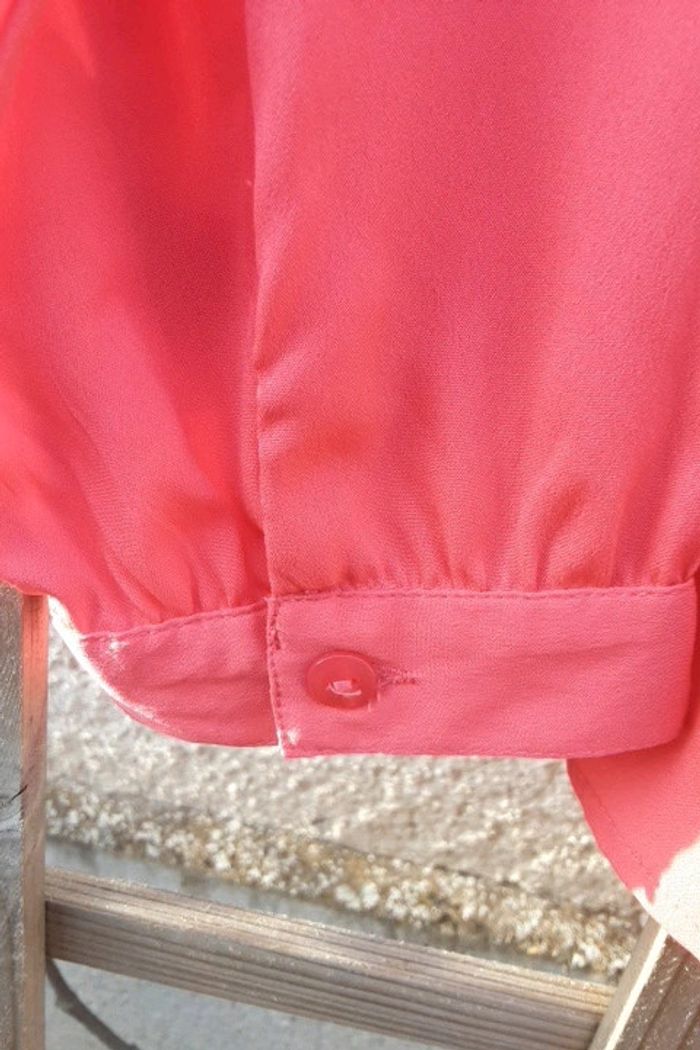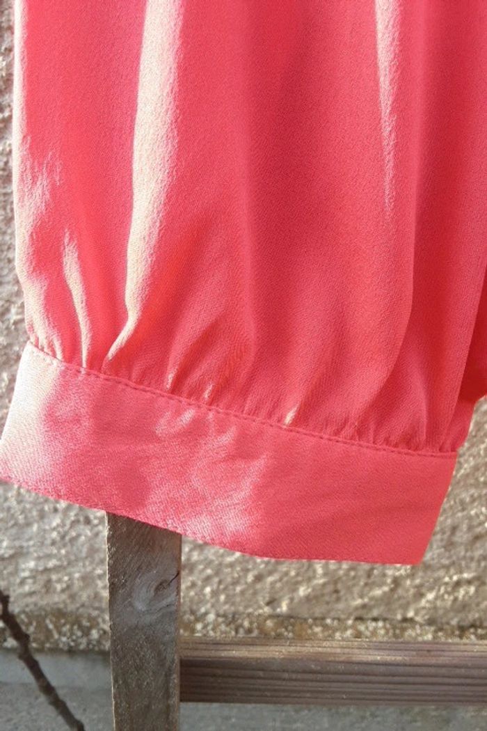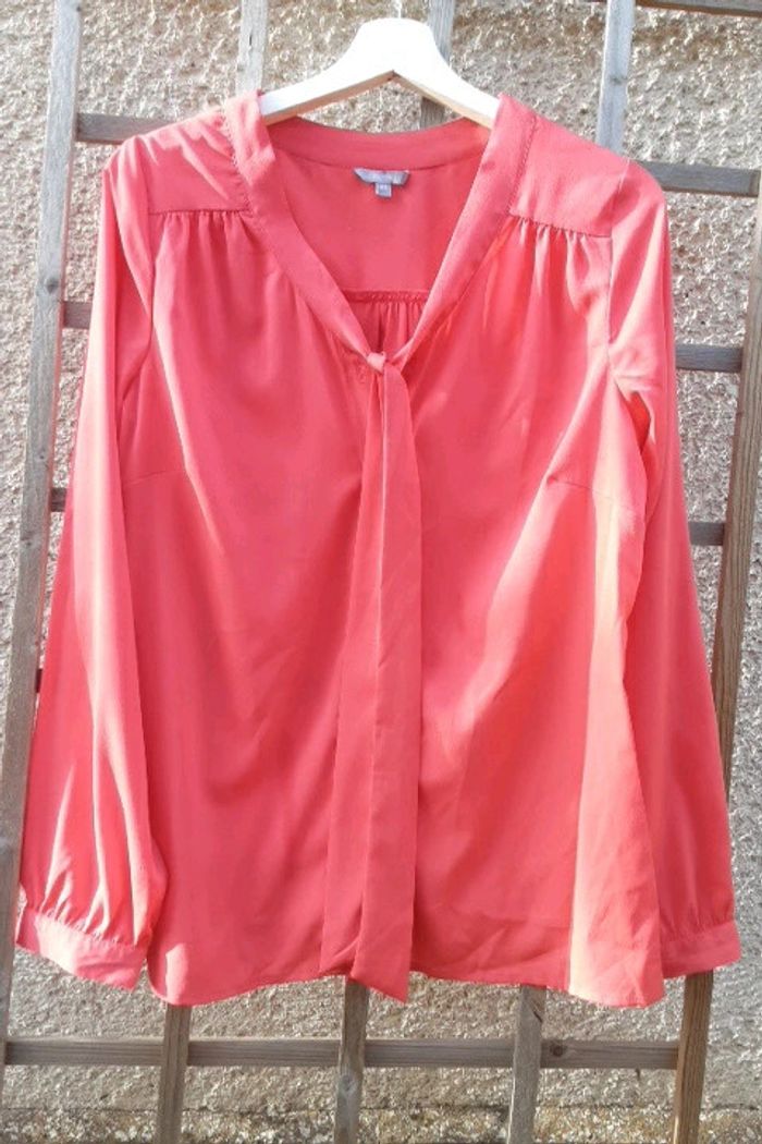 Manches longues couleur saumon neuf.jamais porte juste essaye .très beau viscose souple.tres élégant boutonne devant plus cravate a nouer