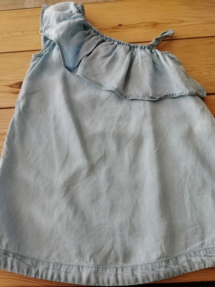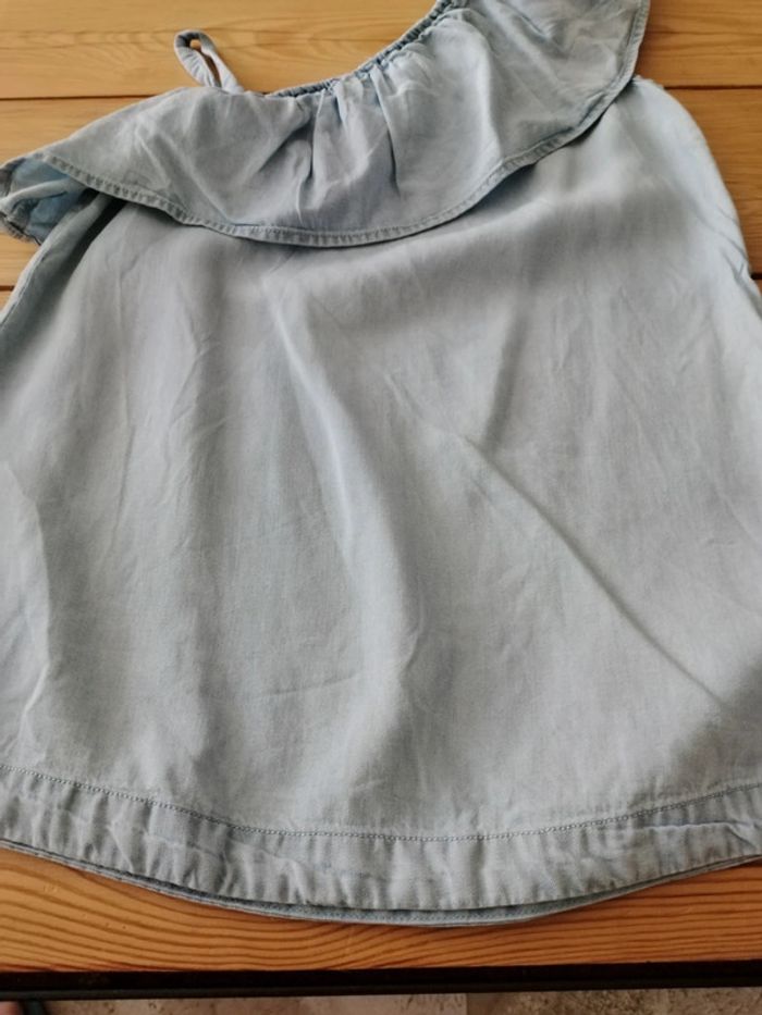 Robe courte ou tunique Couleur bleu jean clair Élastique sur le haut avec volant Bretelle sur un coté Très bon état 4 ans