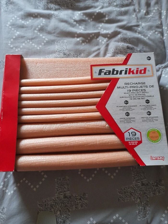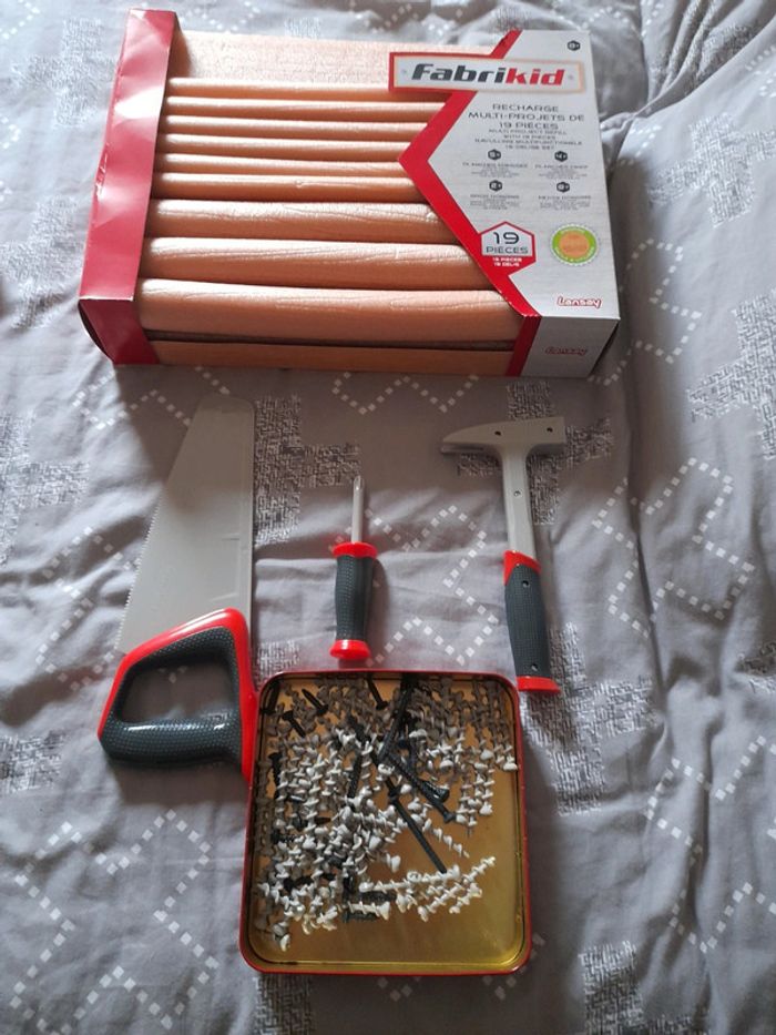 Recharge du jeux fabrikid. Il n'est pas neuf des pièces ont été prises et certaines rajouté d'une autre recharge. Mon fils n'y jouant plus je rajoute les outils + les vis vendus dans le kit initial. Tout est en très bon état.