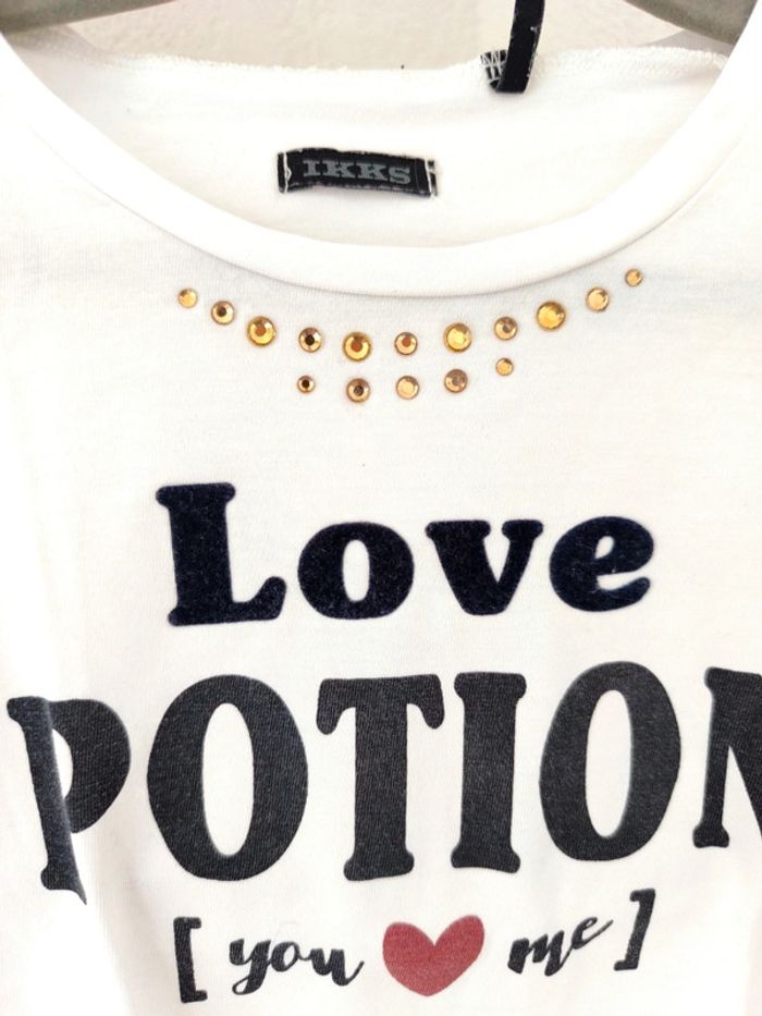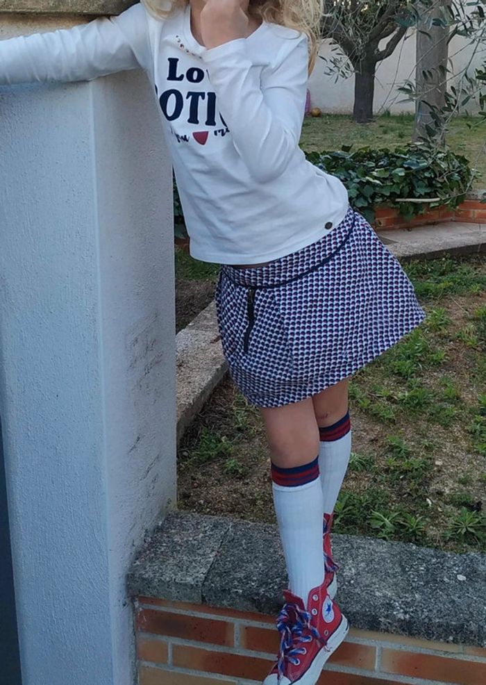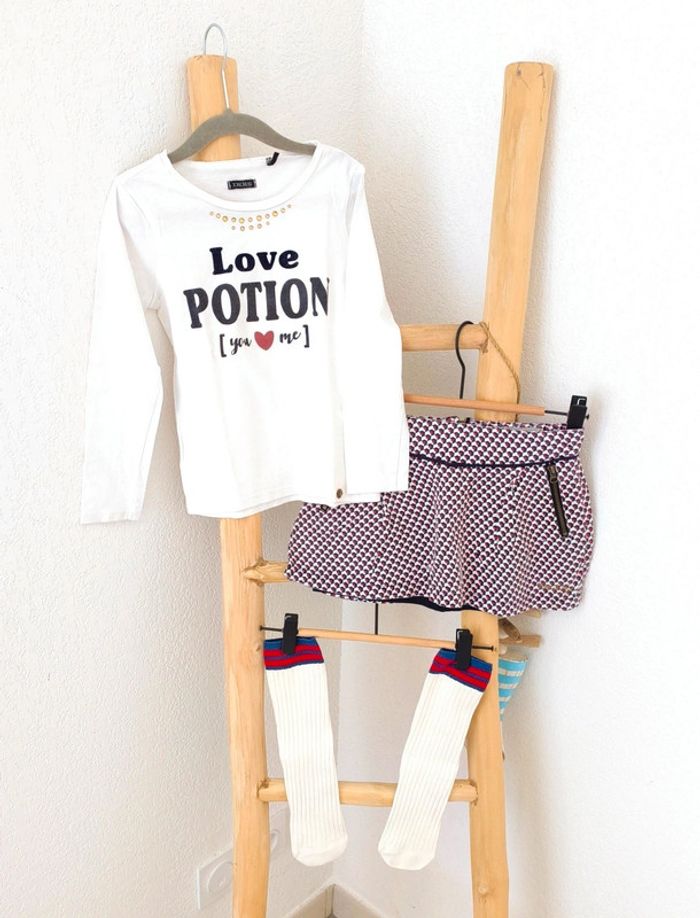 Ensemble T-shirt "love potion" IKKS très bon état , jupe Jean Bourget , un accroc reprisé photo 4, se fond dans le motif et ne se voit pas porté. Chaussettes hautes. Tons bleus blanc rouge #loulaliefille6ans dans la recherche pour voir tout mon 6 ans Kiabi seconde main ou beebs possible