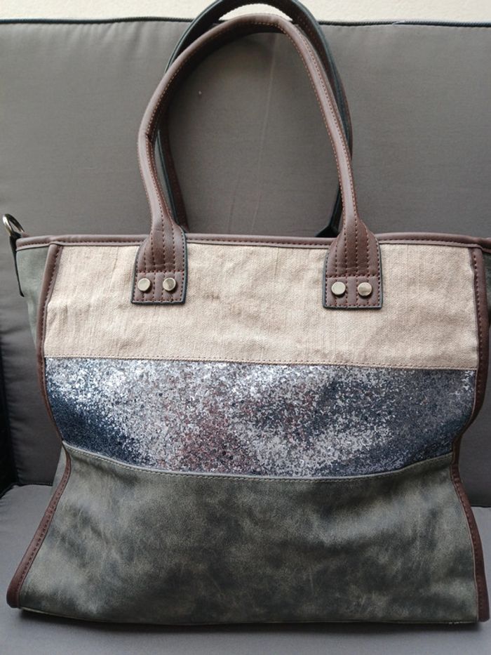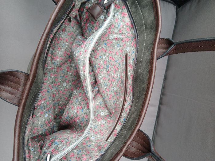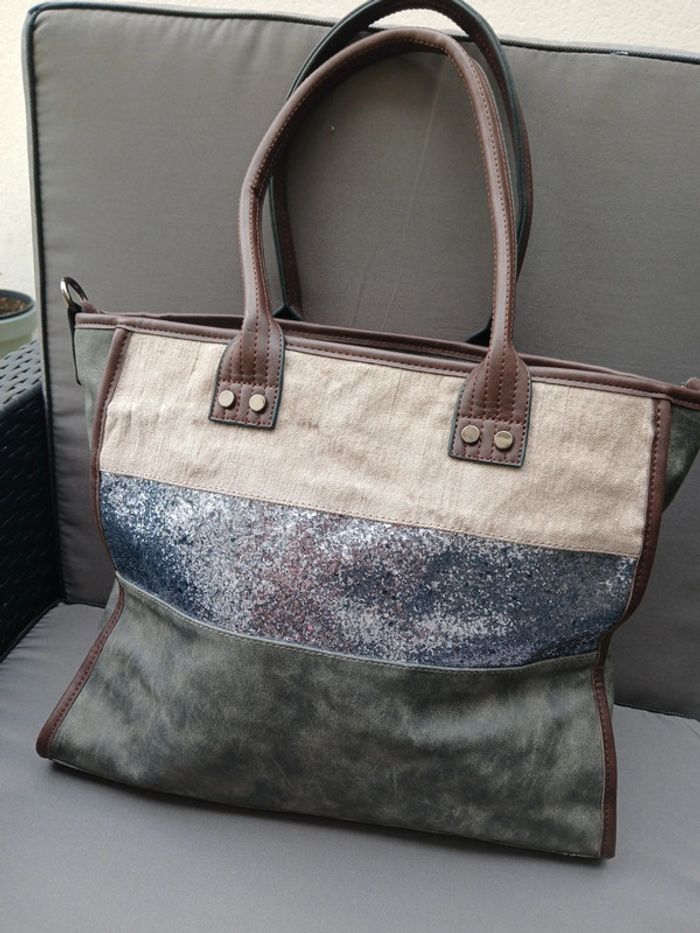 Très beau sac fourre tout, couleur gris et beige, sequins sur le devant, intérieur fleuri, fermeture, très pratique.