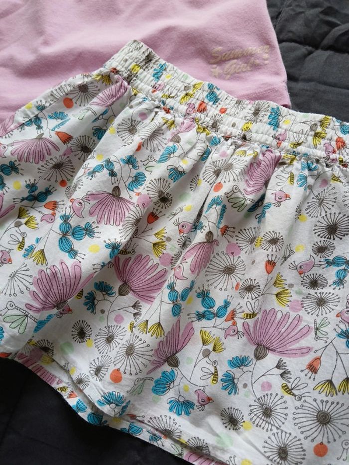 Joli ensemble jupe à motifs estival et débardeur rose, taille 3 ans, marque Kiabi.