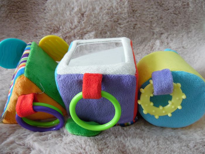 3 petites peluches à formes géométriques, avec matières différentes à l'intérieur. #emilia326jouets