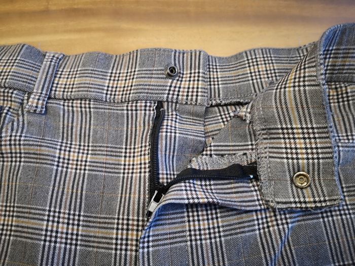 Pantalon type legging à carreau avec bouton et fermeture éclair. Bon état