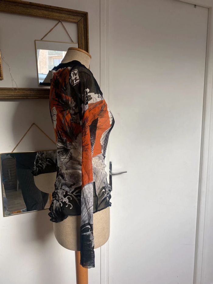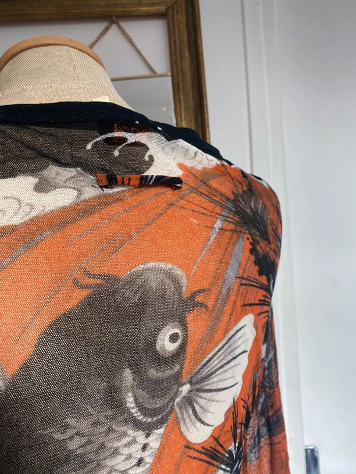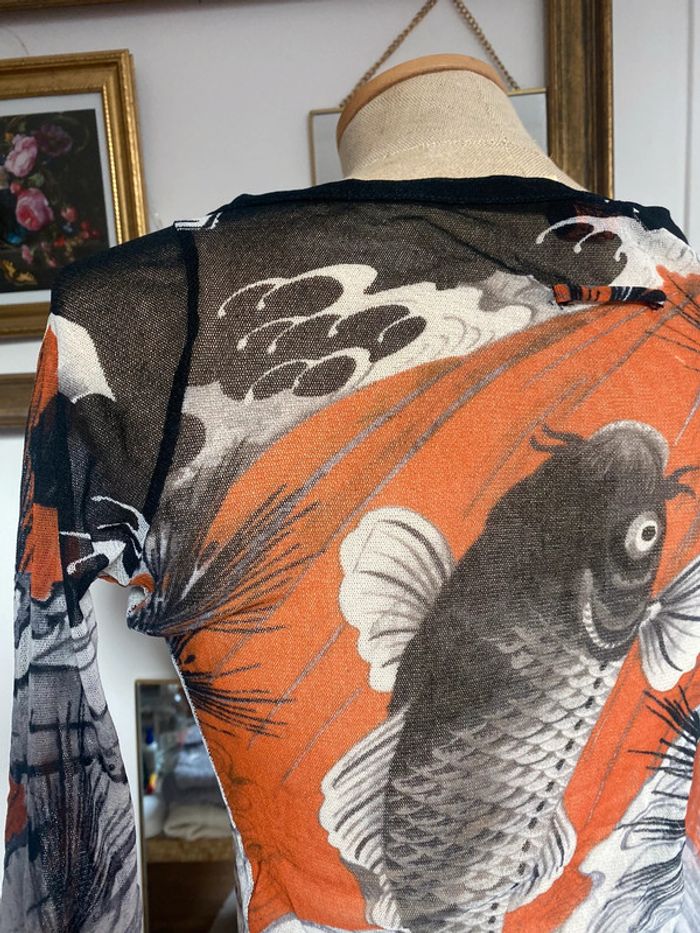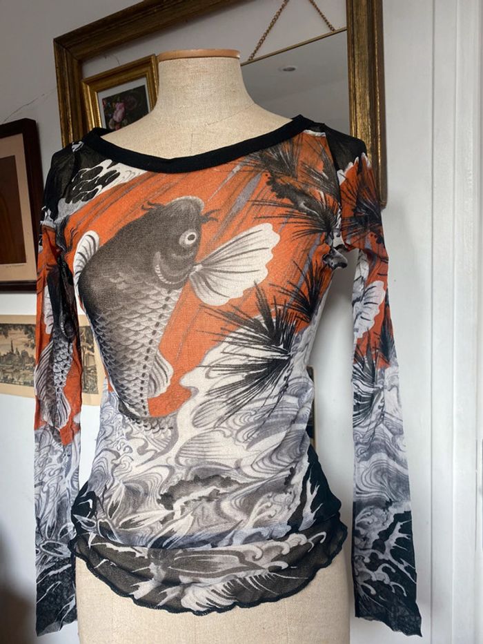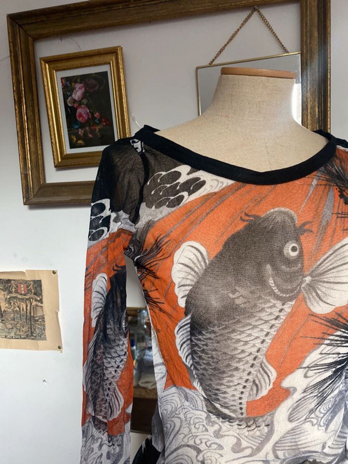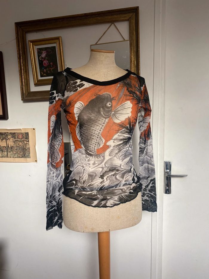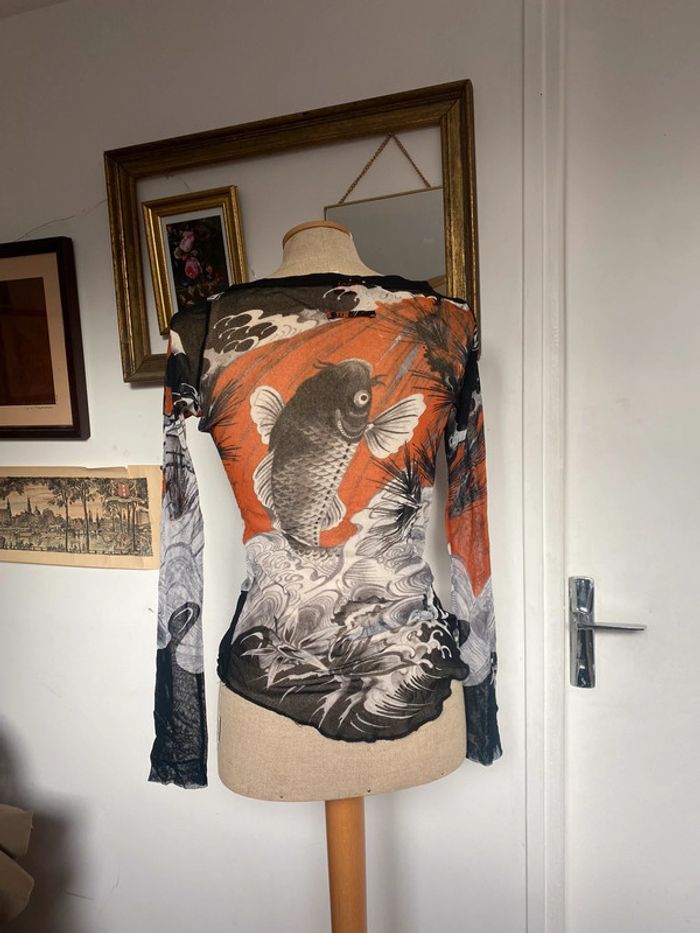 Sublime haut à manches longues Jpg Jean-Paul Gaultier Taille M Très rare , joli pièce des années 2000 y2k vintage Motif carpe poisson De couleur orange, blanc et noir Matière mesh résille transparent