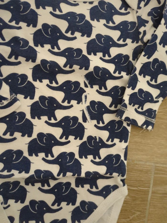 Bodies 3 mois Attention voir celui avec tous les éléphants : défaut sur l'impression du motif déjà présent à l'achat