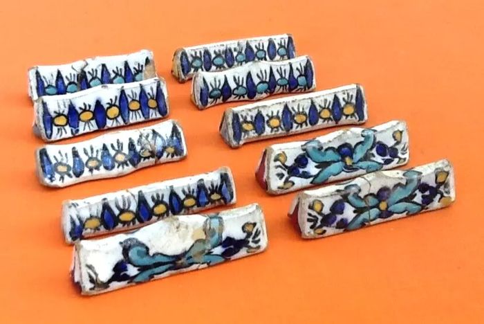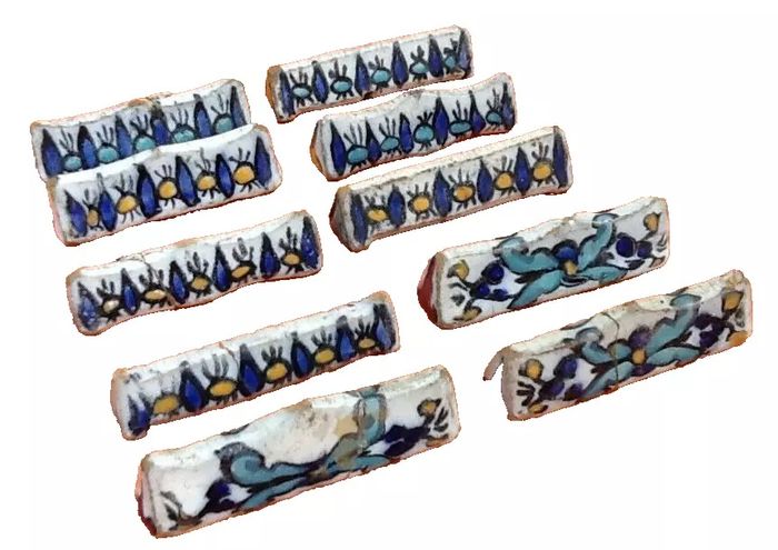 (article vendu en l' état, état d 'usage, nous précisons fêle, recollage, saut d' émail voir toutes les photos) Années 1930 10 Porte-couteaux Céramique vernissée Tunisienne de Nabeul Décor artistique marqué par l' usage de motifs colorés traditionnels Longueur : 70mm Largeur : 20mm Hauteur : 22mm Poids total : 275grs
