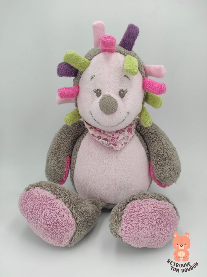 🦔 Doudou Peluche musicale hérisson gris et rose se prénommant Manon, Collection Manon et Alizée, Nattou Avec un foulard à fleur rose autour du cou. Pour déclencher la musique il faut tirer sur la tirette en plastique blanche. 📏 Dimension : 28 cm environ ✨ État : Occasion, très bon état 🧼 Lavé avec lessive hypoallergénique 👀 Vous achetez le doudou que vous voyez sur les photos.