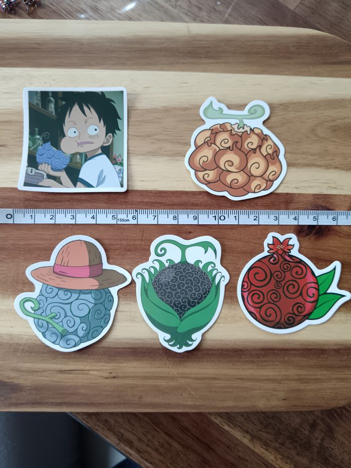 5 stickers sur le thème de One Piece représentant les fruits du démon
