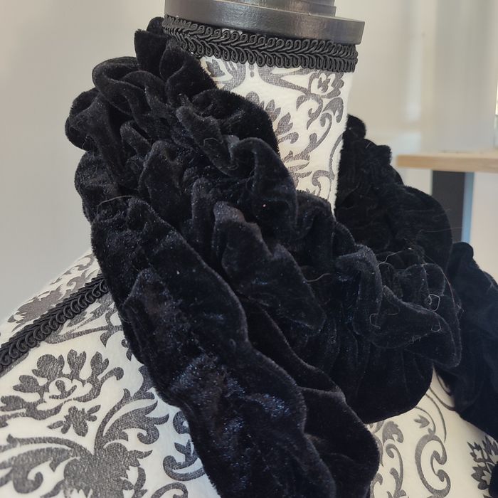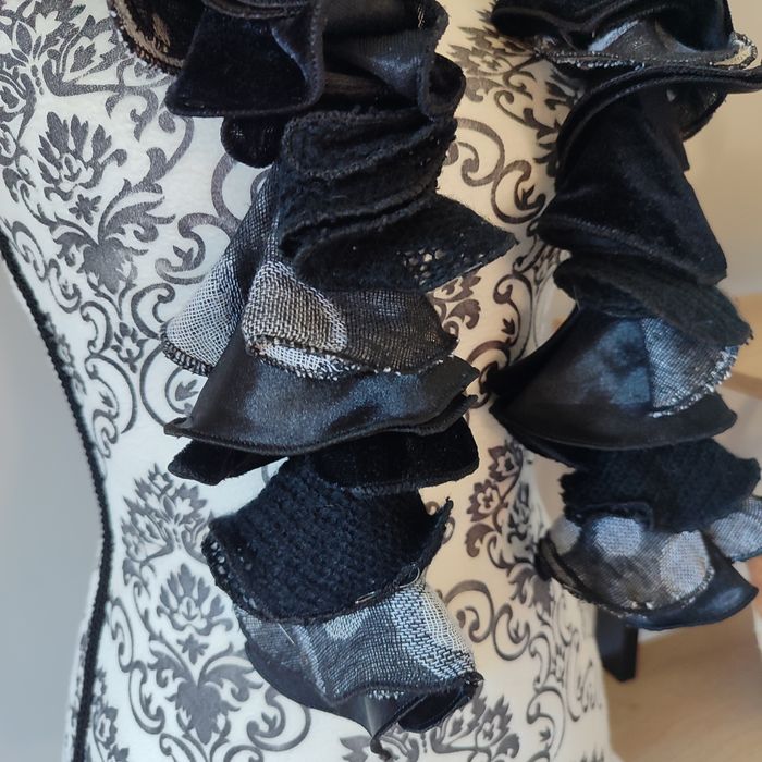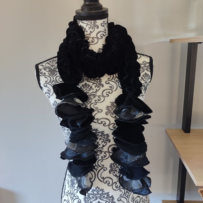 Echarpe tire-bouchon noir Très jolie écharpe noir avec des empiècements sur le bas de différentes matières. #echarperose64121