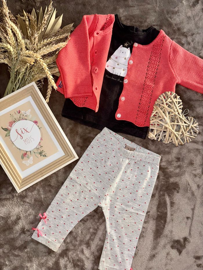 Ensemble pour filles en six mois, composé de trois pièces : • un haut manches longues anthracite • un gilet en laine, manches longues, couleur corail • un legging gris à pois, couleur corail
