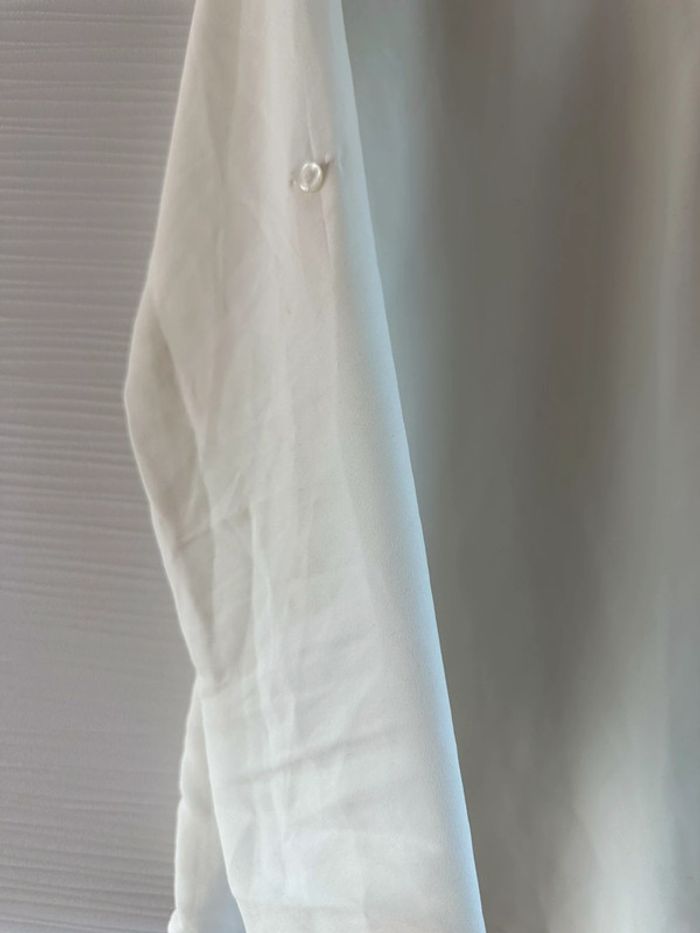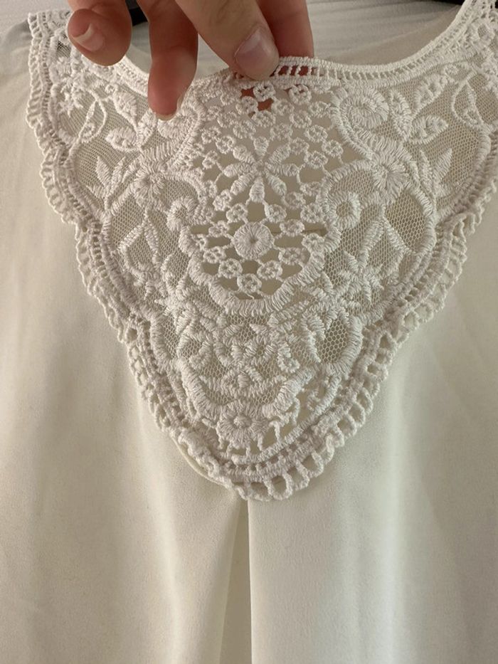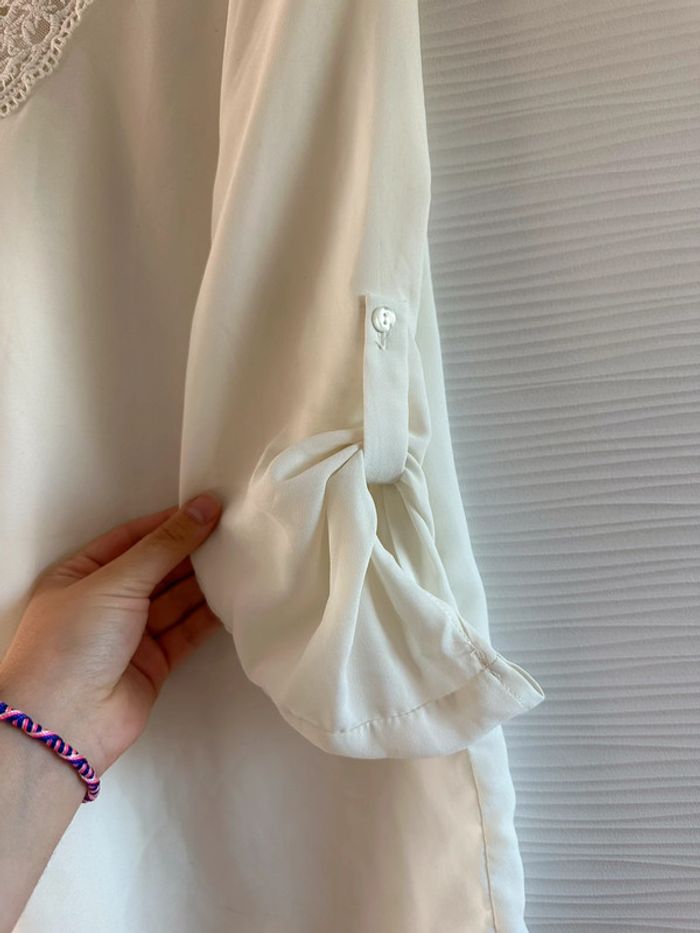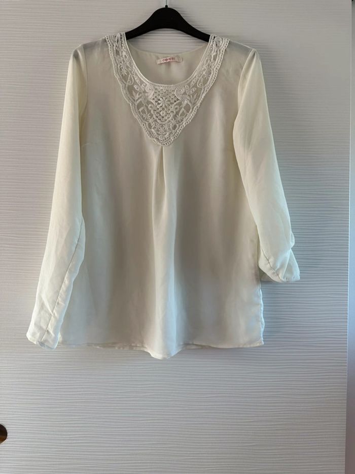 Blouse blanche camaïeu, manches retroussables, dentelle au col. Très bon état. Taille: 38