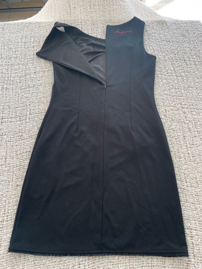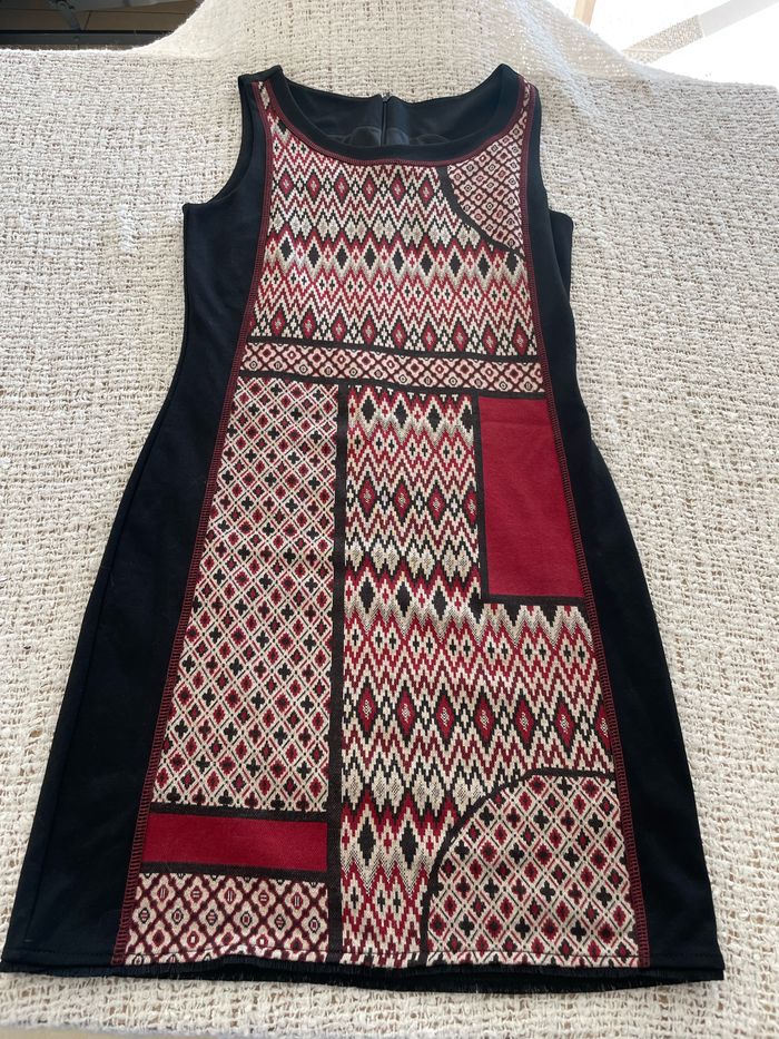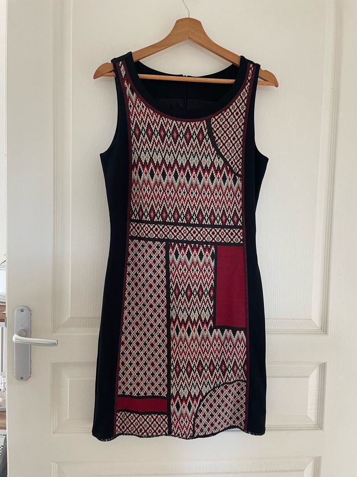 Robe « Desigual » noire à motif bordeaux, fermeture éclair dans le dos, doublure à l’intérieur, taille S, TBE Largeur mesure prise sous les aisselles 42 cm Longueur 89 cm #sandra13190femmestailleS #sandra13190chapeau_accessoire_bijoux_sac