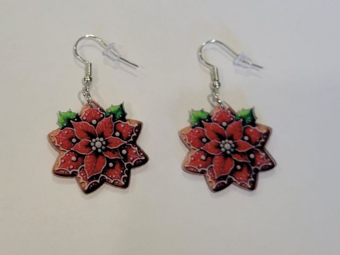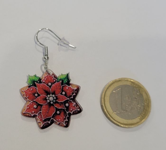 BOUCLES D'OREILLES FLEUR DE NOEL POINSETTIA ! NEUF ! 1 jolie paire de boucles d'oreilles motif FLEUR POINSETTIA . Hauteur totale: 5 cms . Diametre de la fleur : 2,7 cms. Imprimées recto-verso. N'hésitez pas à regarder mes autres ventes. Produit neuf sous emballage ! Envoi rapide et soigné
