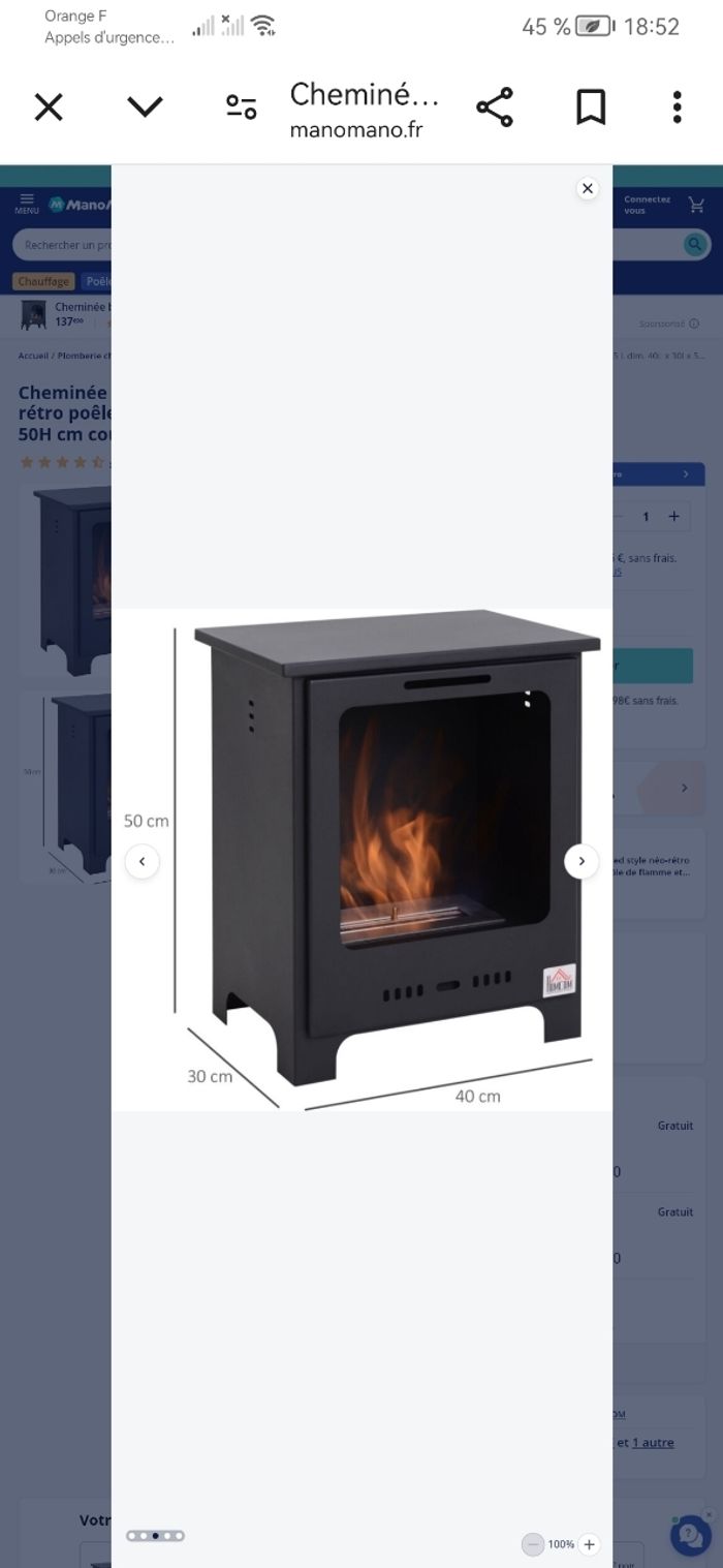 Cheminée fonctionnent au bioethanol. Elle chauffe une pièce de 30 m2 sans difficulté