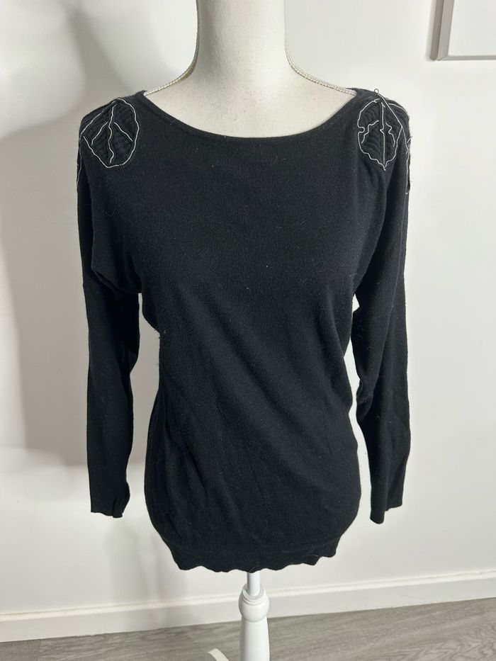 Pull - Excellent état - Taille 38 équivalent M - Couleur noire - Chaînes argentées au niveau des épaules en forme de feuilles - Marque Camaïeu - Col rond large - Plus d’étiquette de taille ni de matière - Ultra doux et chaud