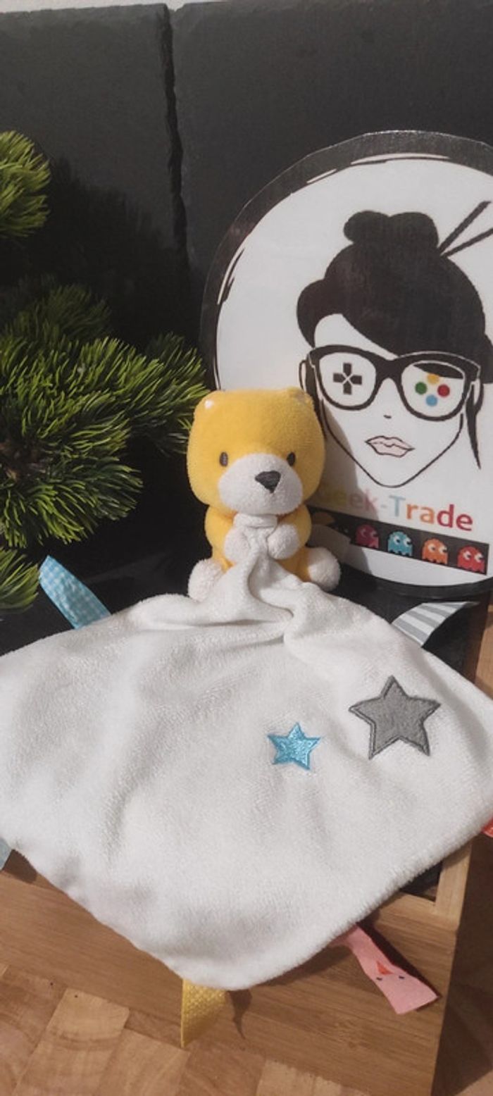 doudou ours chat chien lion hema mouchoir jaune blanc etoiles gris bleu - photo numéro 1