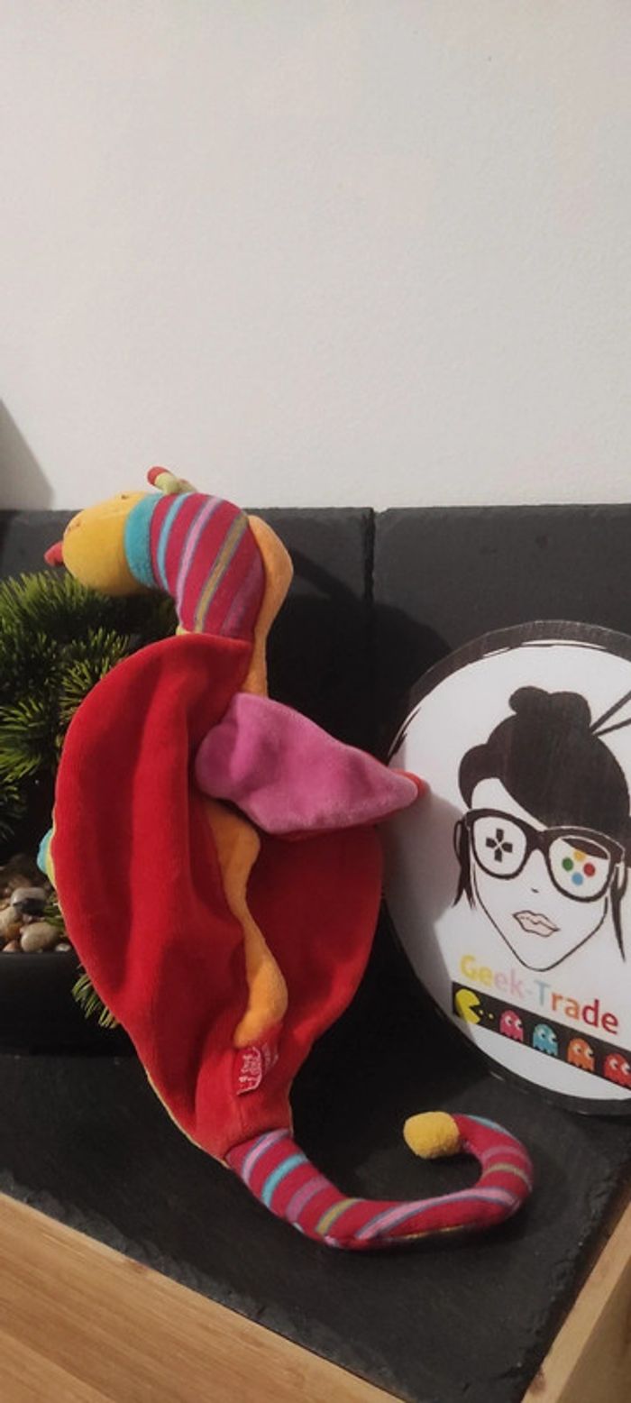Doudou dragon plat dragobert rouge vert rayure rayé langue Peluche Moulin Roty - photo numéro 1