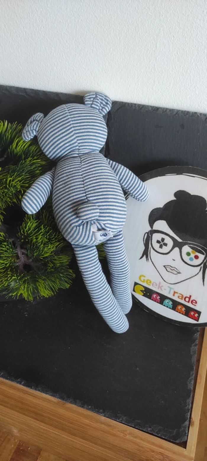 Doudou peluche ours gris bleu rayures Petit Bateau rayé blanc - photo numéro 1