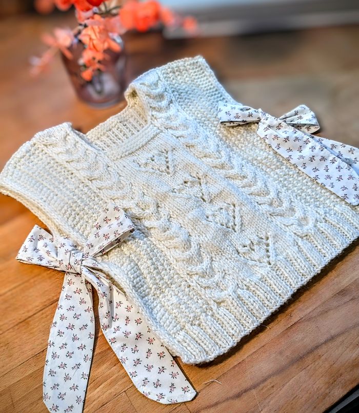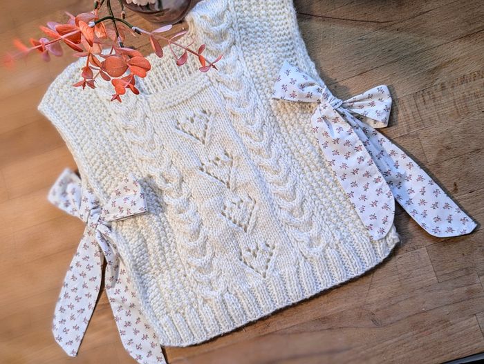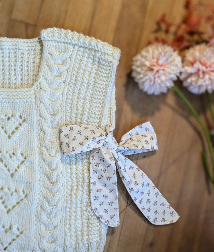 Un très joli en laine acrylique Très doux adapté aux peu de bébé Un style tendance ouvert sur les côtés Avec des attaches en coton style liberty.