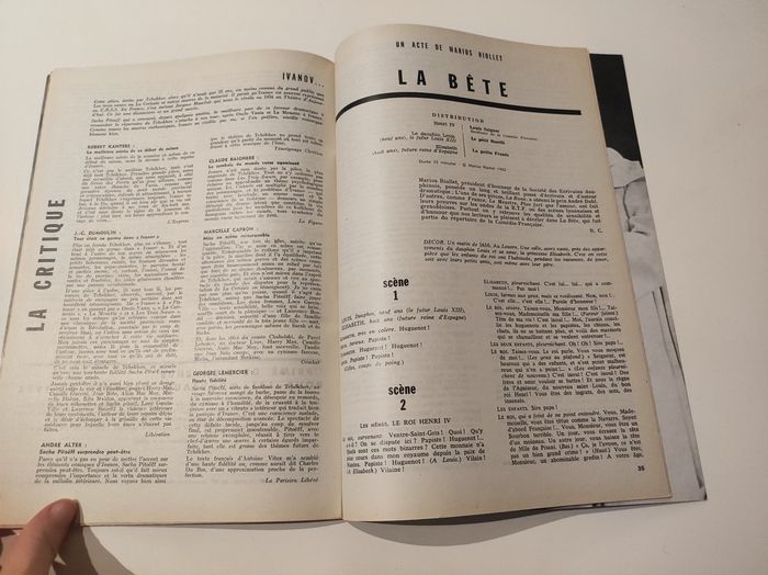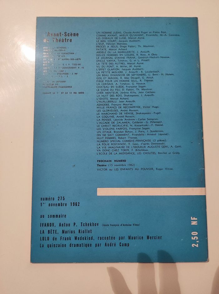 Livre revue de théâtre ancienne. L'Avant-Scène n 275 1 er novembre 1962. / 50 pages. / Vintage Format 28,5 x 18 cm. Couverture souple Sommaire : - Ivanov ( intégrale) par Tchekhov présenté et mise en scène par Sasha Pitoeff / drame en 4 actes - La bête ( integrale ) par Marius Rollet / Un acte - Lulu de franck wedekind , racontée par Maurice Mercier - La quinzaine dramatique par André Camp Cette revue bi mensuelle permettait de découvrir une ou plusieurs pièces de théâtre en lien avec une sortie dans un théâtre. Elle comporte des photos d'époques en noir et blanc (Bourvil , Sacha pitoëff, Luce Garcia - ville, lulu etc ), le texte de pièces de théâtre avec les détails de mise en scène. Des critiques et des actualités de sortie théâtre de l'époque. Très bon etat / légères imperfections coins exterieur L'isbn ne correspond pas complètement car l'ouvrage est trop ancien.