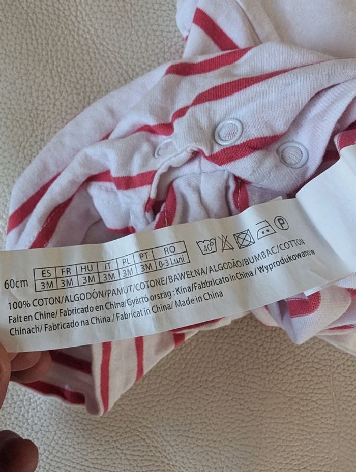 Barboteuse 3 mois rayée in extenso Rayée rose et blanche 100%coton Boutonnée à l'entre jambe