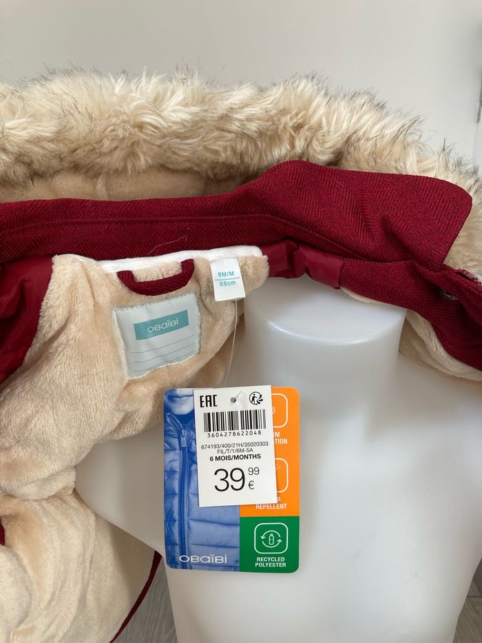 Manteau bébé de chez Obaïbi. Taille 6 mois. Il est neuf, il y a encore l’étiquette de l’achat (Prix d’achat 39,99€). Envoi rapide et soigné.