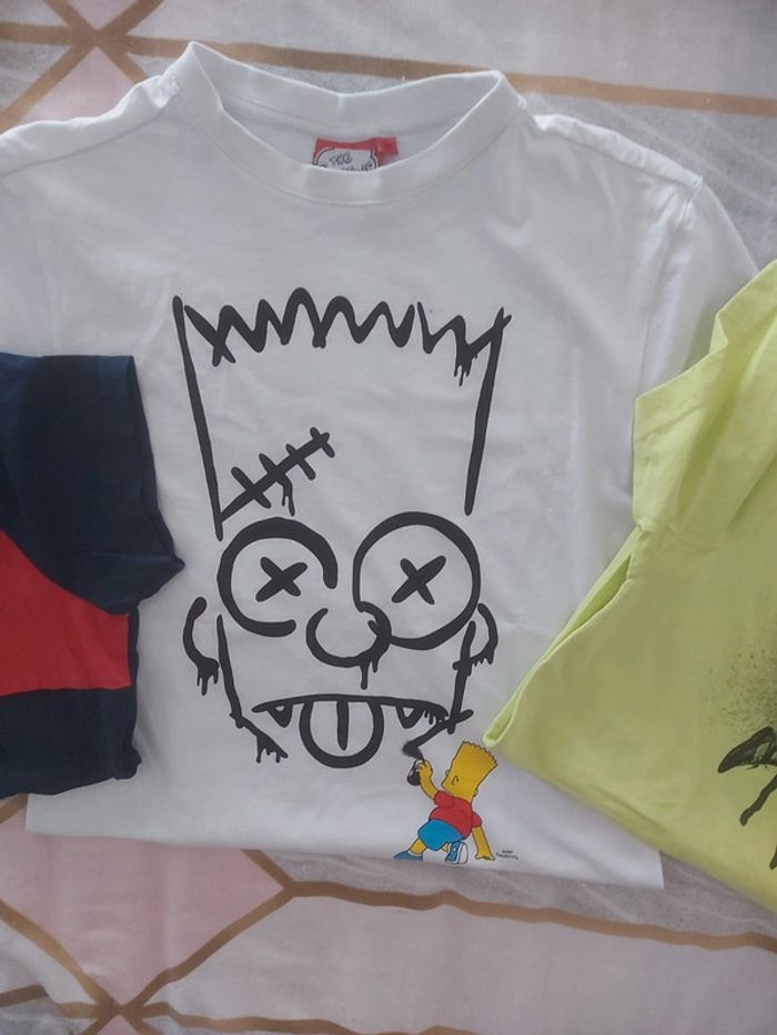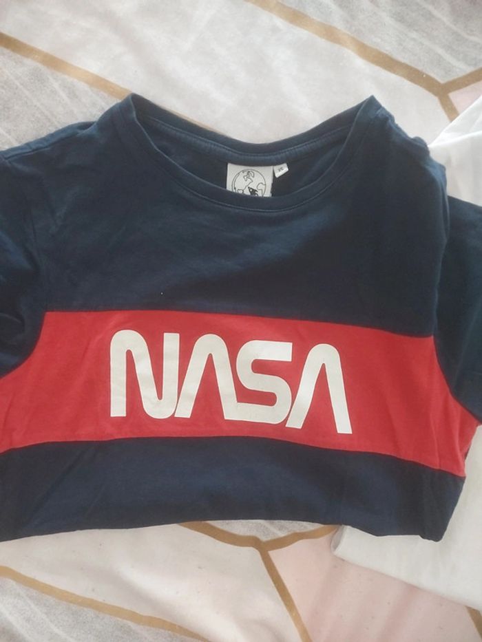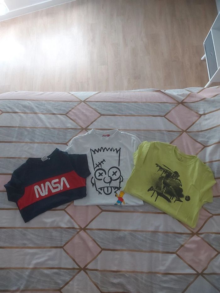 Porté quelques fois : 🔹️Tshirt NASA: Taille XS ado, bon état. 🔹️ Tshirt Bart Simpsons: Taille Xs ado, très bon état. 🔹️Tshirt H&m joueur foot: Taille 16+, très bon état.