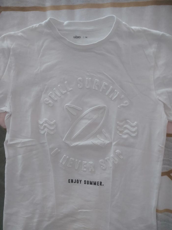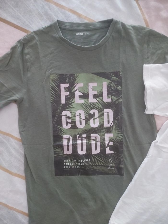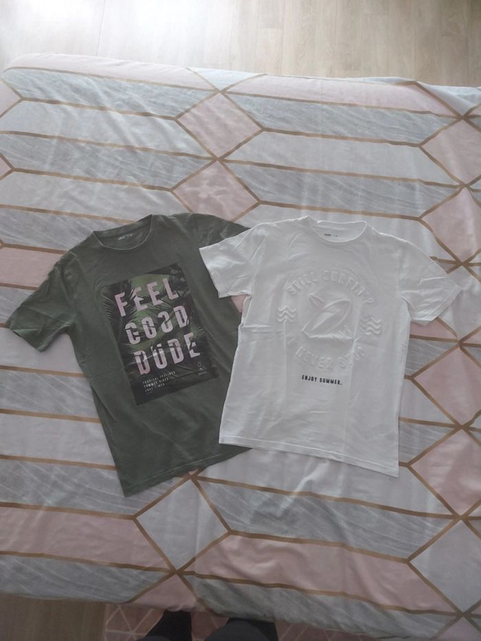 🔹️Tshirt Kaki: petit trou discret en bas du tshirt, voir photo, bon état. 🔹️Tshirt blanc: aucune tâche, très bon état, motif texturé.