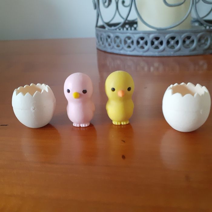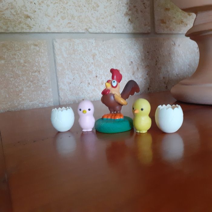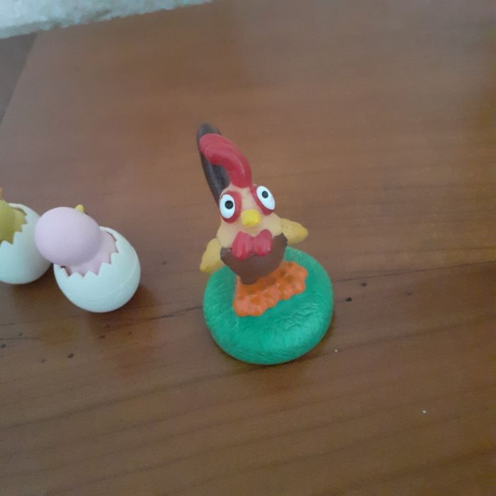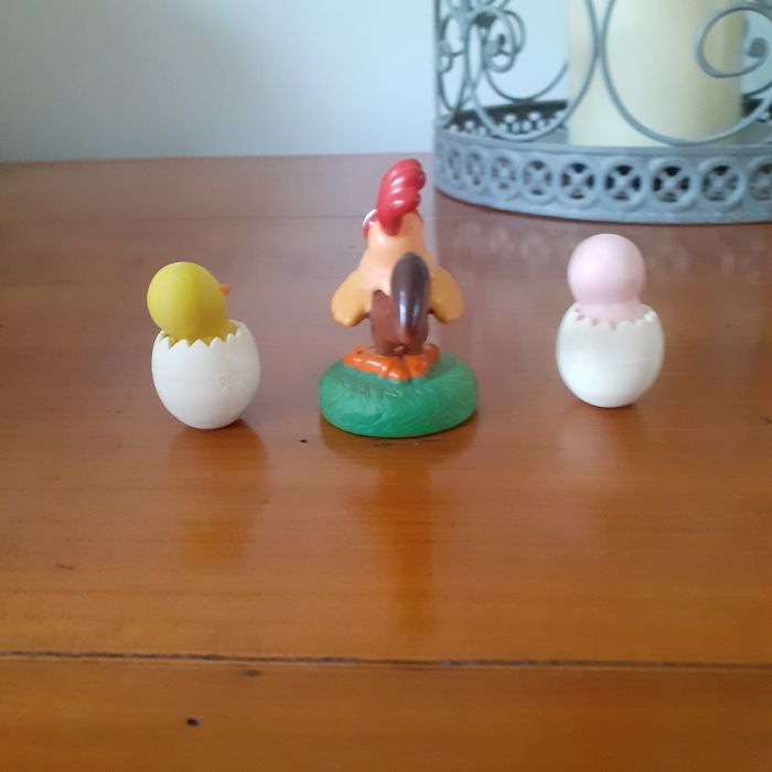 Articles neufs. Comprend : 1 figurine Coq 🐓 sur socle; multicoloris; en plastique semi rigide. Hauteur totale de 5 cm + 2 figurines Poussins 🐤 dans leurs coquilles amovibles. Figurines en plastique souple. Hauteur totale ( dans la coquille ) de 2,8 cm // voir photos pour détails