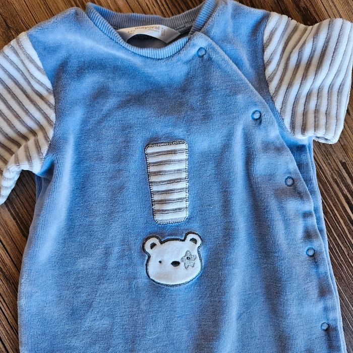 Très beau pyjama en velours, blanc et bleu clair motif ourson. Ouverture à l'avant. Taille 4/6 mois, 70cm. Marque Mayoral. Excellent état, comme neuf il est tout doux ! #bbtony_garcon_6mois Réductions activées : - 20% à partir de 2 articles - 30% à partir de 3 articles - 50% à partir de 5 articles